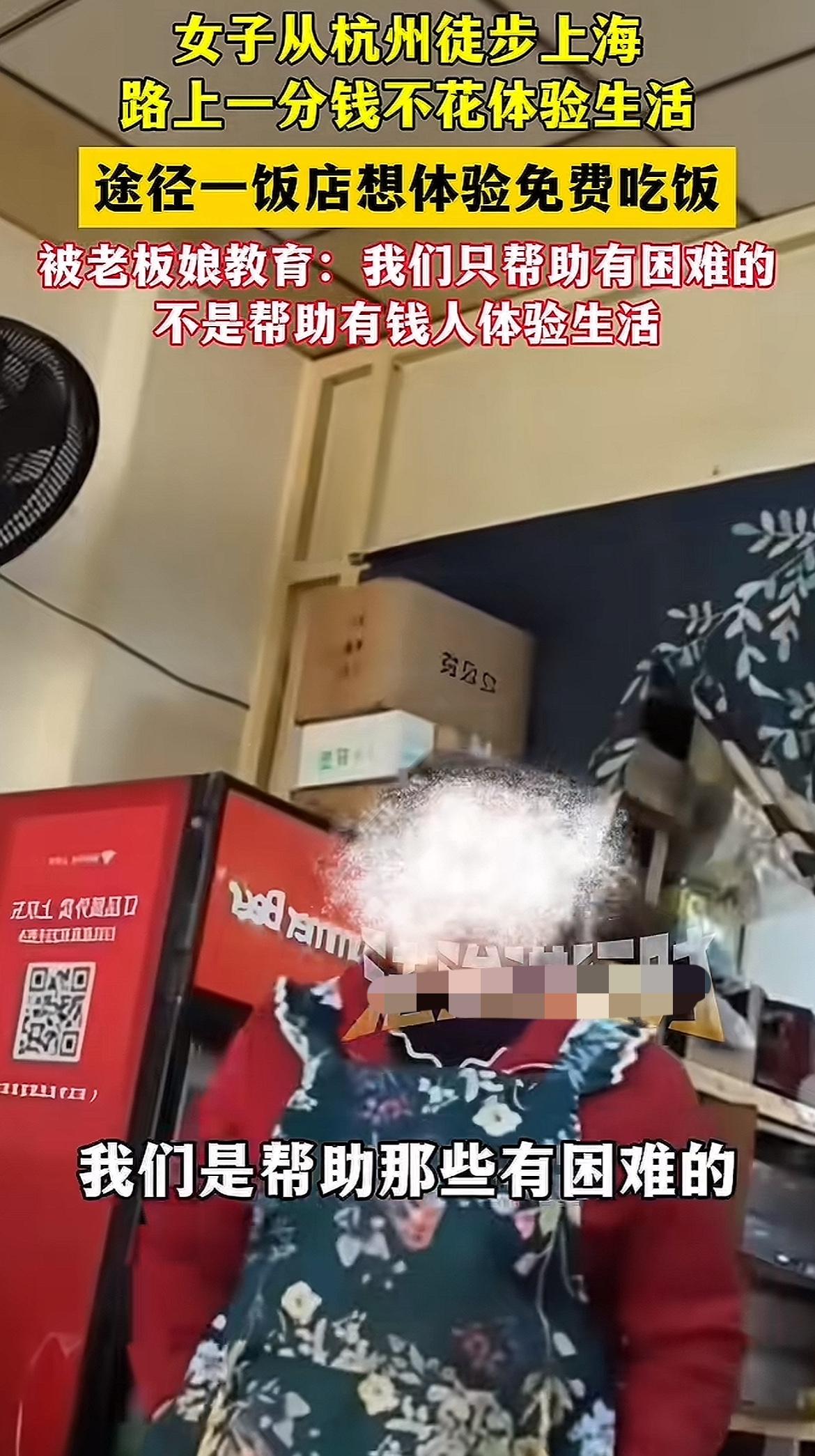 老板娘教训得这种厚颜无耻的人太好了。你有钱人却说体验生活,想一路白嫖消费。体验生活的前提,从来不是消费别人的善意。 女子从杭州徒步上海,搞“零花费挑战”,想靠陌生人帮助解决吃住,这份初衷听着新鲜,做起来却变了味。她衣着整齐、美甲精致,举着手机向路人求助被拒后,又走进一家饭店要免费饭。 老板娘一句话戳破本质:“我们帮有困难的人,不帮有钱人体验生活”。这话听着直接,却说到了点子上。 真正的体验生活,该是靠劳动换所得,比如帮店家洗碗换顿饭,而非心安理得“白嫖”。爱心和便利是给真正陷入困境的人准备的,不是用来满足少数人猎奇心理的工具。 女子的尴尬离场,恰恰说明这种“零花费挑战”早已偏离了体验生活的本质。你觉得想要体验生活,该用怎样的方式才不越界?