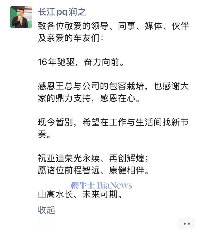 此前消息,赵长江10月在朋友圈发文宣布离职,并告别比亚迪。