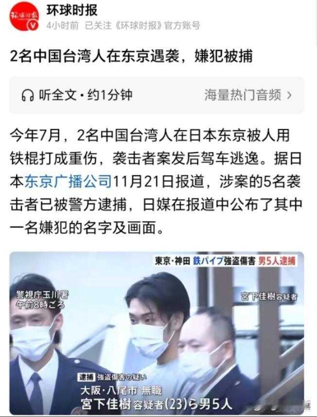 日本社会安全隐患加剧。今日,两个中国台湾人,差点就被歹徒活活打死!如果,无端的丢了性命。招谁惹谁了?为了旅游一时高兴,丢了性命真的不值得!由于高市早苗的涉台不当言论,两国关系紧张。日本仇华人士更多了。非常时期,为了自身安全,还是尽量不去日本旅游购物吧。不要抱侥幸,歹徒虽然被逮到了,被残暴杀死的中国台湾人是活不过来了吧?