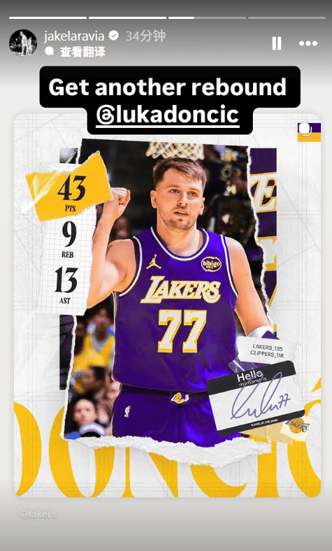 赛后,杰克-拉拉维亚在社交媒体晒出卢卡-东契奇的数据海报并调侃道:“你多抢个篮板啊。”