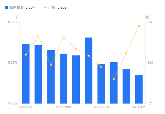 日期A股户数(户)流通A股户均持股数(股)户均持股市值(万元)2025-11-105672315629.678.912025-10-315758515395.718.382025-10-205736215455.568.592025-09-306060514628.538.292025-09-195841415177.218.712025-09-105862215227.528.912025-08-295906115114.348.432025-08-205968014957.578.772025-08-085980314926.818.482025-07-316055114742.418.34