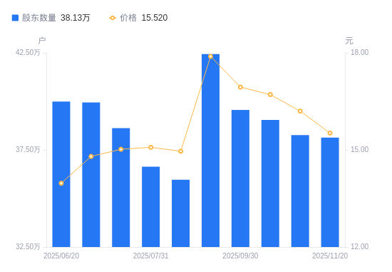 日期A股户数(户)流通A股户均持股数(股)户均持股市值(万元)2025-11-203813328458.7413.132025-11-103826398429.8513.662025-10-103904458261.3213.802025-09-303955758154.1813.812025-08-314243607601.0713.602025-08-083596488968.7413.422025-07-313663598804.4513.282025-07-183861828352.5112.552025-06-303994258075.5811.952025-06-203999428065.1411.27