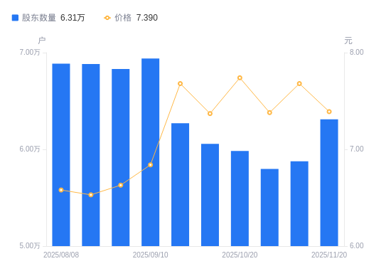 日期A股户数(户)流通A股户均持股数(股)户均持股市值(万元)2025-11-206311421631.5215.992025-11-105876923230.8117.842025-10-315797623548.5617.382025-10-205983922815.4117.662025-09-306056422542.2916.612025-09-196271021770.8716.722025-09-106939919672.5013.462025-08-296830619987.2913.252025-08-206883119834.8312.952025-08-086885619827.6313.05