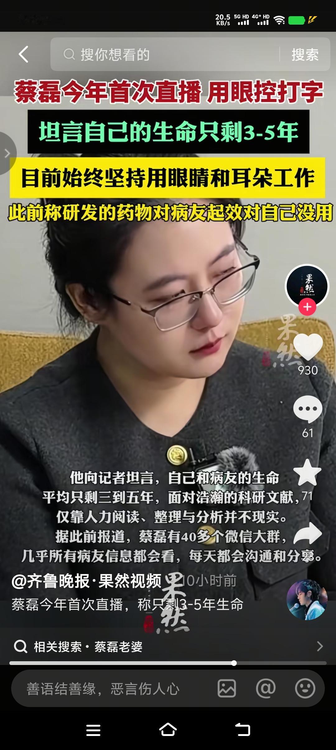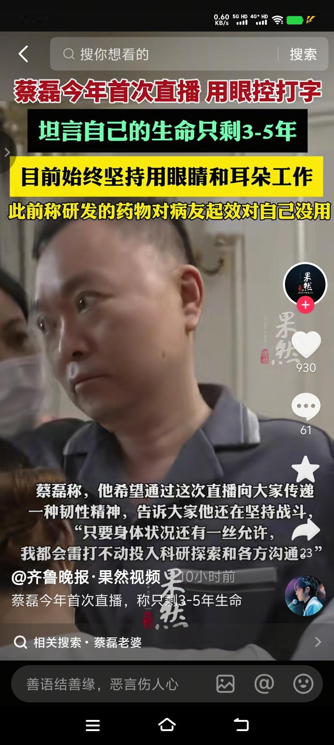 蔡磊今年首次直播,坦言自己生命只剩3~5年。说句不好听的话,换作别人早就坚持不到