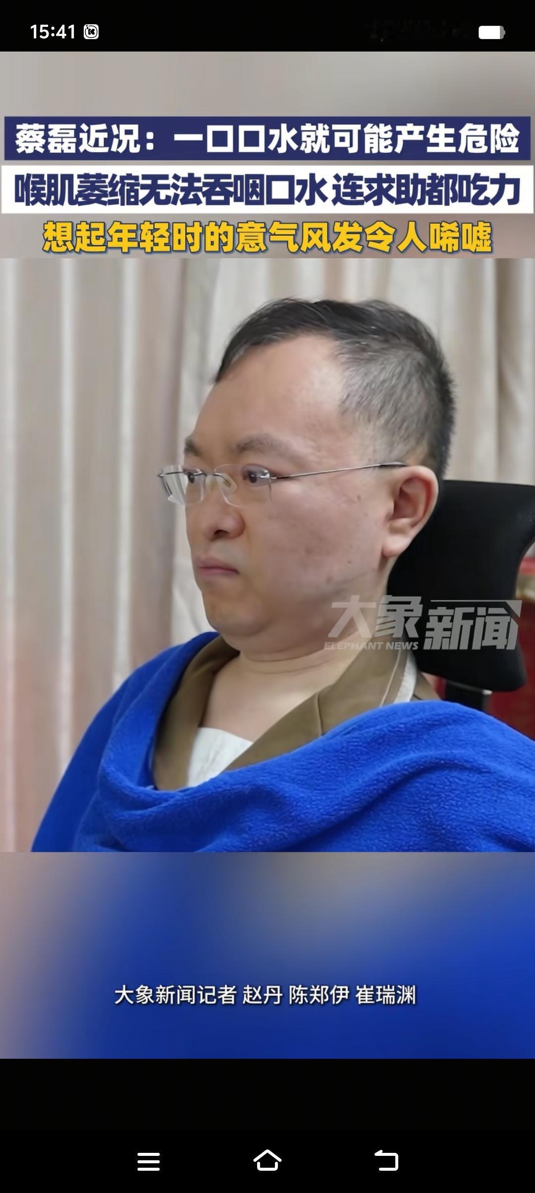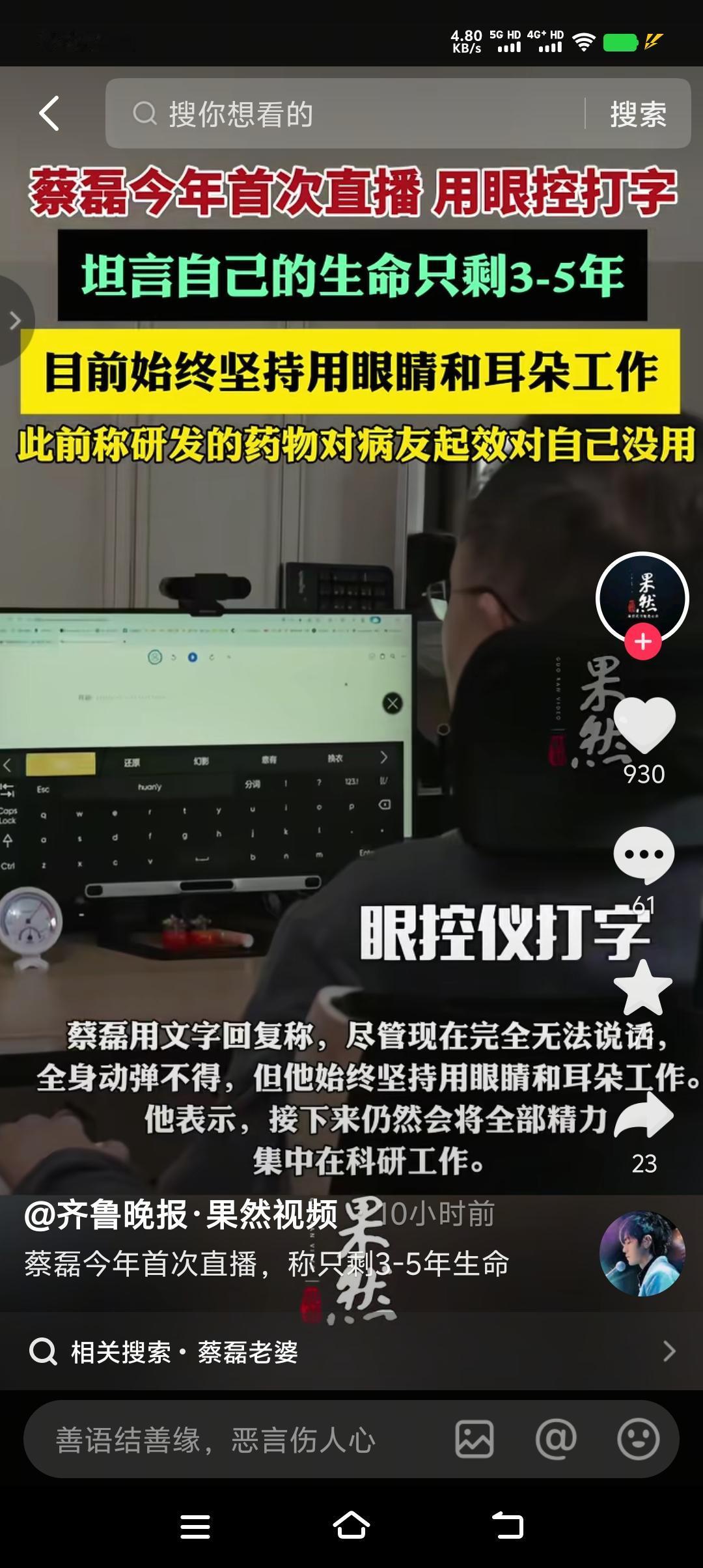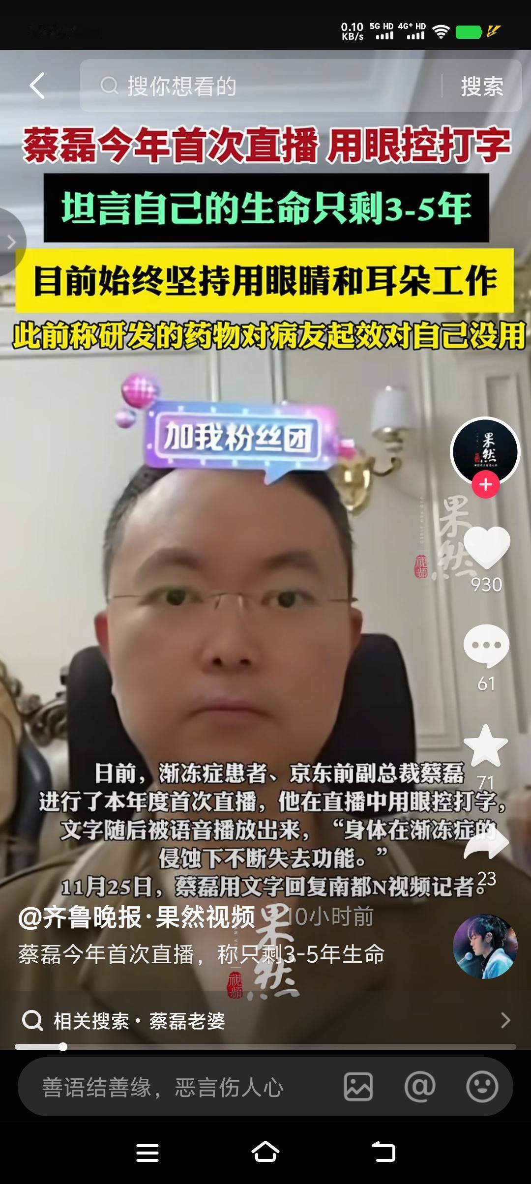 蔡磊今年首次直播,坦言自己生命只剩3~5年。说句不好听的话,换作别人早就坚持不到现在了。以蔡总的段位,身价上亿应该没问题,只要能用钱治好的病都不是问题,问题是再多的钱在世界顽症面前也是废纸一堆。 只有感官器官没被冻住,剩下的所有器官都被冻住,就连正常呼吸都是一种奢望。生不如死,活着没有任何尊严,说白了只剩一副躯体。正像蔡磊所说“看见流浪汉眼里全是羡慕,能健康就好了,哪怕捡垃圾”。所以说人来到这个世上,拥有什么都不如拥有一个健康的身体,名和利都是浮云,只有健康伴你一生。