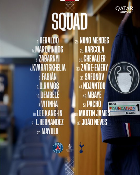 巴黎对阵热刺大名单:登贝莱领衔,阿什拉夫、杜埃缺阵