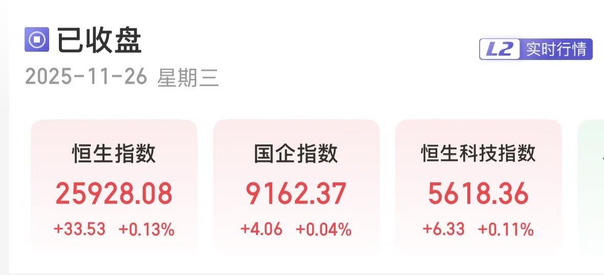 上证报中国证券网讯(刘禹希记者严晓菲)11月26日,港股三大指数小幅收涨。截至收盘,恒生指数涨0.13%,报25928.08点;恒生国企指数涨0.04%,报9162.37点;恒生科技指数涨0.11%,报5618.36点。