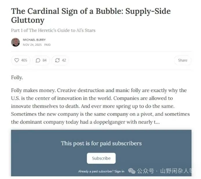 大空头迈克·波瑞也趁机火上浇油,作为在2008年做空次贷危机的他兑现承诺,发布了重磅文章《泡沫的主要迹象:供给侧的暴食》,将矛头直指英伟达,他把英伟达比作当年为所有人提供‘镐子和铲子’的Cisco,认为其同样背负着宏大的市场愿景。但盈利不等于安全,他用1999年互联网泡沫类比:当时也有盈利强的“四骑士”(微软、英特尔、戴尔、Cisco)主导市场,不是那些小网站在撑场面。他从历史、高利润公司角色、会计折旧问题、供给侧扩张担忧,提供了一个说服力强的框架,试图证明我们正处于另一个巨大的泡沫中。