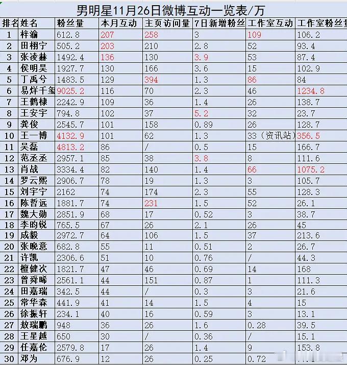 本月互动前三:梓渝、田栩宁、张凌赫主页访问量前三:丁禹兮、梓渝、陈哲远7日新增fs前三:王安宇、张凌赫、范丞丞gzs本月互动前三:梓渝、丁禹兮、肖战gzs fs总数前三:易烊千玺、肖战、王一博梓渝多个前三