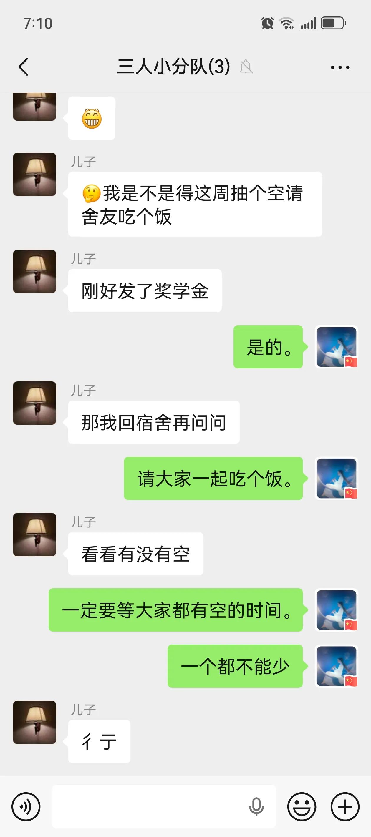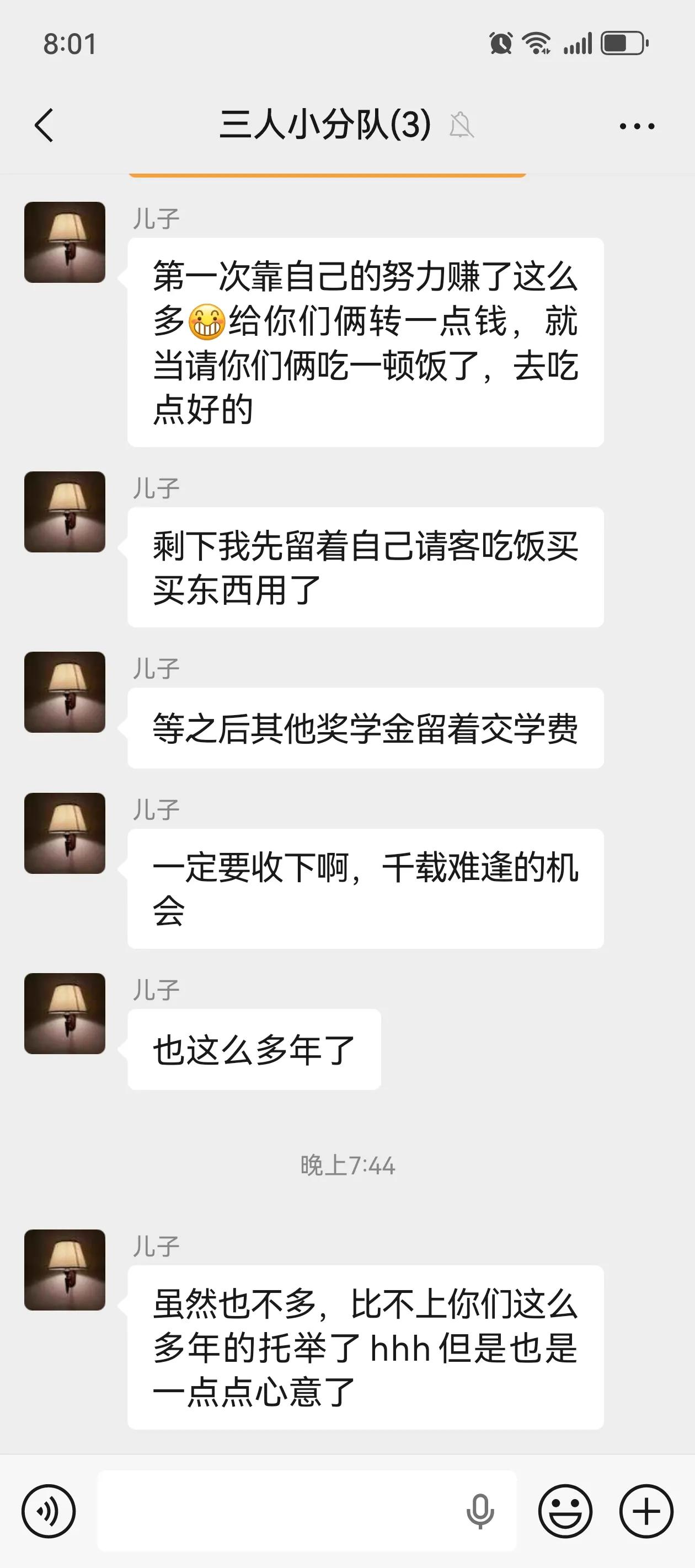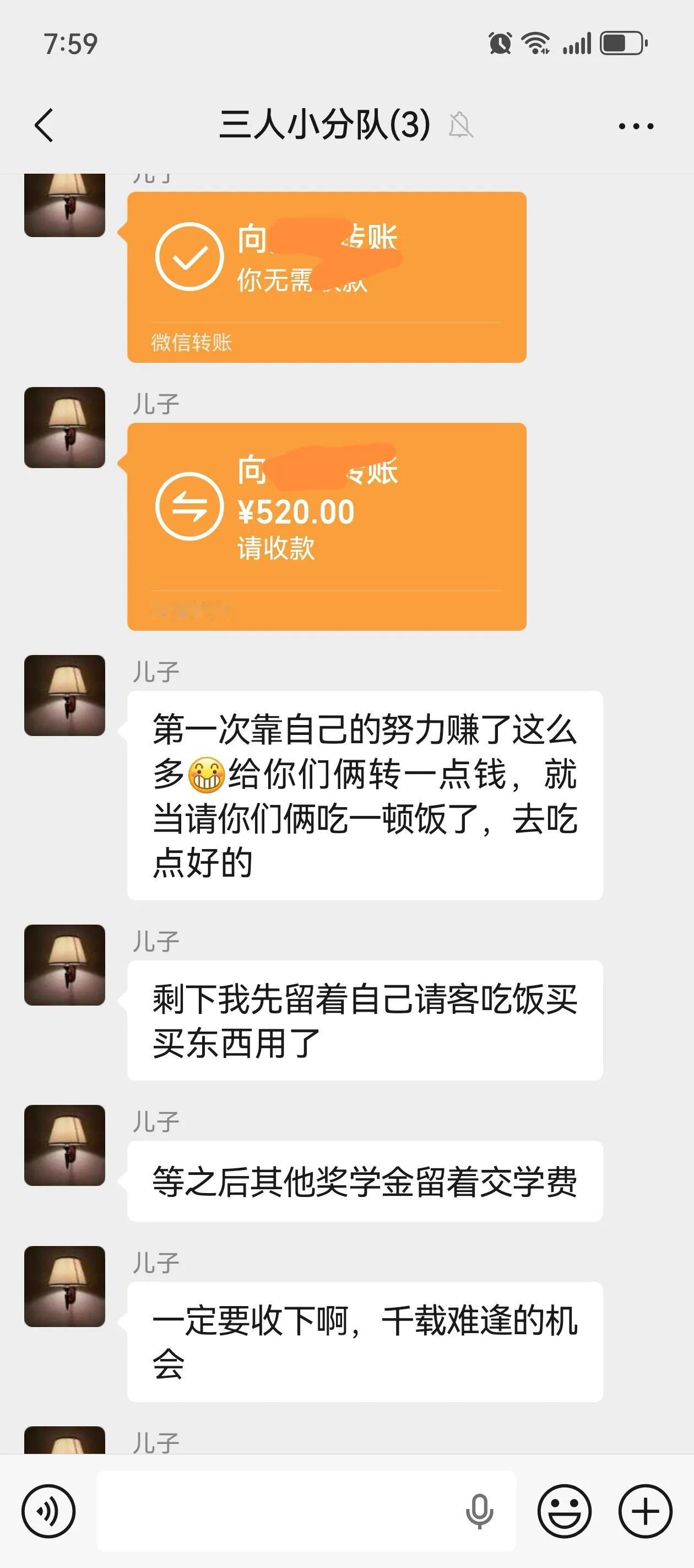 儿子的奖学金发了,一共16000元,今天发第一项3000元。 他很开心,我建议他请同宿舍的孩子一起吃顿饭,学会分享快乐。 没想到他又转了520元给我,真的很意外。 更感动的是他的话,忽然发现一下子長大了许多,也许这就是收获,更是为人父母辛苦努力的动力吧。 在这一刻,之前所有的辛苦,也都值得的。 相信,每一个孩子,都是父母眼里那道最亮的光。即便一时蒙尘,也终有散光耀眼光芒的一刻。