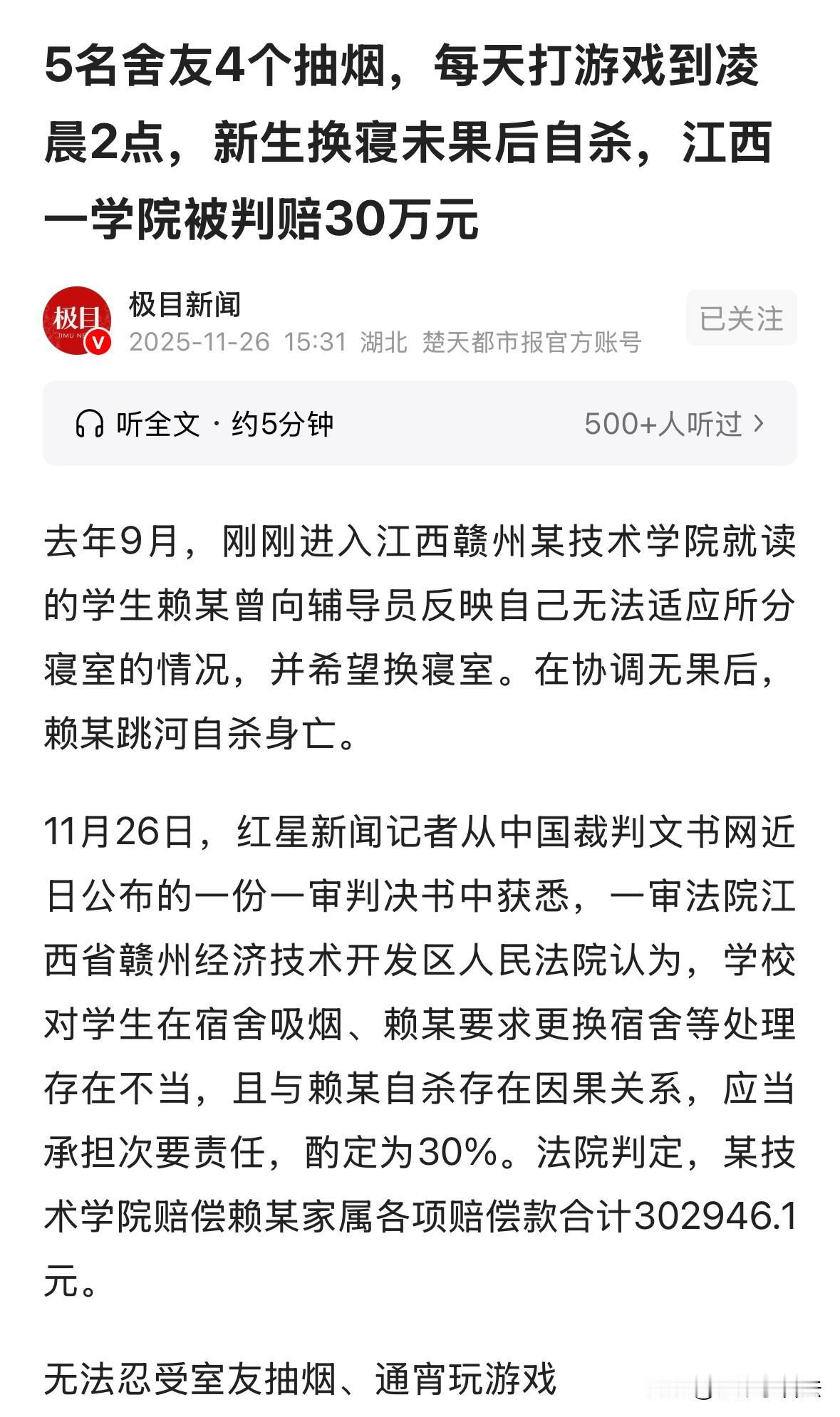 江西赣州,男生大一开学后发现室友5人4个抽烟,每晚打游戏到凌晨2点,严重影响睡眠和生活,向辅导员申请换寝。辅导员说太远不好管理,没有答应,男生又多次提出请求,并扬言要跳楼,仍然没得到解决,于是男生跳河自杀。事后男生家属将学校告上法庭索赔,法院这样判决。   赖某在高考披荆斩棘,终于考上心仪的大学,开启人生新篇章,却因无法适应新宿舍而选择终止了自己的生命,让人惋惜。   2024年9月18日,赖某和其他学子一样,从高中生一下子成长为大学生,带着对未来的憧憬,踏进大学的校园,展开新的人生旅程。   赖某选择的是6人寝,刚办好入学手续,就迫不及待的去找自己的寝室,结交新的朋友,毕竟赖某还要和其他5个人共同生活4年的大学时光。   同寝室的男生们看起来都挺好相处的,赖某让父母放宽心,就让父母回家了。   岂料大学生活仅仅3天,赖某就找到辅导员要求更换寝室。   赖某对烟味很敏感,寝室一共6个人,5个舍友4个抽烟,再在这样的宿舍环境呆下去,赖某都要窒息了。   辅导员罗某某并没有答应赖某的调整寝室的要求,提出太远不好管理的拒绝理由。   赖某不抽烟也不打游戏,真的无法适应成天烟雾缭绕的寝室环境,还有每天成宿打游戏到凌晨2点的喧闹声,于是继续向辅导员提出调寝室的请求。   罗某某为了安抚赖某,给赖某打过来2次语音电话,赖某才不再提及要更换寝室的要求。   罗某某以为事情就这样过去了,但是赖某没过多久还是申请更换寝室,还表示寝室的生活很让他窒息,在这样下去,就会跳楼。   罗某某虽然担心赖某,经常和赖某沟通,但是对于赖某提出更换寝室的要求,却一直都没有解决。   3天后,罗某某给赖某打语音电话,却一直无人接听,罗某某赶紧把情况和学校反映,学校在2024年9月23日报警   警方经过调查并查看监控后,于24日从河里将赖某的尸体打捞上岸,赖某早已失去生命体征。   警方对赖某对尸体进行勘查,赖某的身体表面并无外伤,口鼻里有泥沙,可以排除他杀以及刑事案件。   赖某就读的大学是封闭式管理,刚刚开学还不到一周的时间,赖某就发生不幸,其家属很是不能理解。   赖某的家属赶到学校,通过警方的调查后才知道,原来赖某的投河自杀是有诱因的,是因为辅导员没有答应赖某的换寝要求。   赖某家属认为赖某的死亡与学校没有答应更换寝室有直接的因果关系,于是将学校告上法庭,要求对赖某对死亡进行赔偿。   赖某的事情在学校里传的沸沸扬扬,每个人都有不同的看法。   大学生活不仅是为了继续深造学习知识,更多的是培养自理能力,提升自我,学会独自处理并解决问题。   有些人认为赖某有些小题大做,都已经是成年人,却没有解决事情的能力和对事物的承受能力,只会选择极端的方式处理问题,自食其果。   还有些人认为,学校本就应该对学生的安全尽到责任和义务,而且赖某提出换寝室的要求并不过分,学校一直不予处理,才是逼迫赖某走向极端的导火索。   法院经过审理后这样认为:   根据《民法典》第1002条的规定:自然人享有生命权,生命安全和生命尊严受法律保护,任何组织或个人不得侵害他人的生命权。   赖某作为具有完全民事行为能力人,对自己的行为应有认知风险的能力。在未能够处理好无法调整寝室的情况后,选择结束自己的生命,其自身应该承担主要责任。   但是反观赖某之所以会选择结束自己的生命,是因为调整寝室的问题无法解决,才导致了赖某走向极端。   通过赖某和辅导员罗某某的聊天记录来看,赖某曾多次向罗某某提出要求更换寝室的要求,但是罗某某都未能够给予解决。   赖某是因为宿舍有很多人抽烟以及舍友打游戏到深夜影响其休息为理由,向罗某某提出的调整寝室的要求,其要求并不过分。   但是学校却未能够给予赖某一个妥善的处理办法,乃至在赖某说出过激烈的言辞,对宿舍的环境感到窒息,扬言要跳楼的情况下,学校仍然未给予重视并解决。   虽然学校辩称有证据证明学校没有忽视赖某提出的换寝要求,并在其提出强烈的要求要更换寝室的第二天,做出了调换寝室的承诺,还对其情绪多次安抚。   但是从赖某提出调换寝室的要求开始,直到赖某结束了自己的生命有6天的时间,但是学校却依旧没有给赖某调换寝室,才让赖某感觉到绝望,选择终结自己的生命。   根据《民法典》第1165条的规定:行为人因过错侵害他人民事权益造成损害的,应当承担侵权责任。   依照法律规定推定行为人有过错,其不能证明自己没有过错的,应当承担侵权责任。   学校对未能够对赖某的请求给予重视,并及时妥善处理问题,存在过错,与赖某的自杀存在因果关系,应该承担次要责任,酌定为30%。   法院判决学校赔偿赖某家属各项赔偿款合计302946.1元。