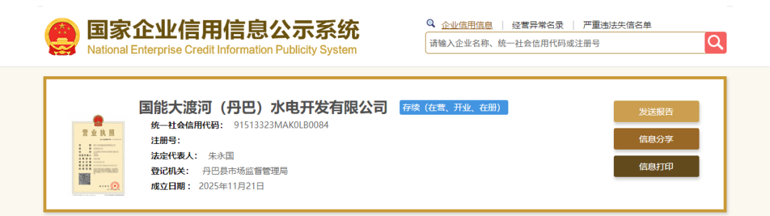 国家企业信用信息公示系统显示,11月21日,国能大渡河(丹巴)水电开发有限公司成立,注册资本36亿元,法定代表人朱永国。