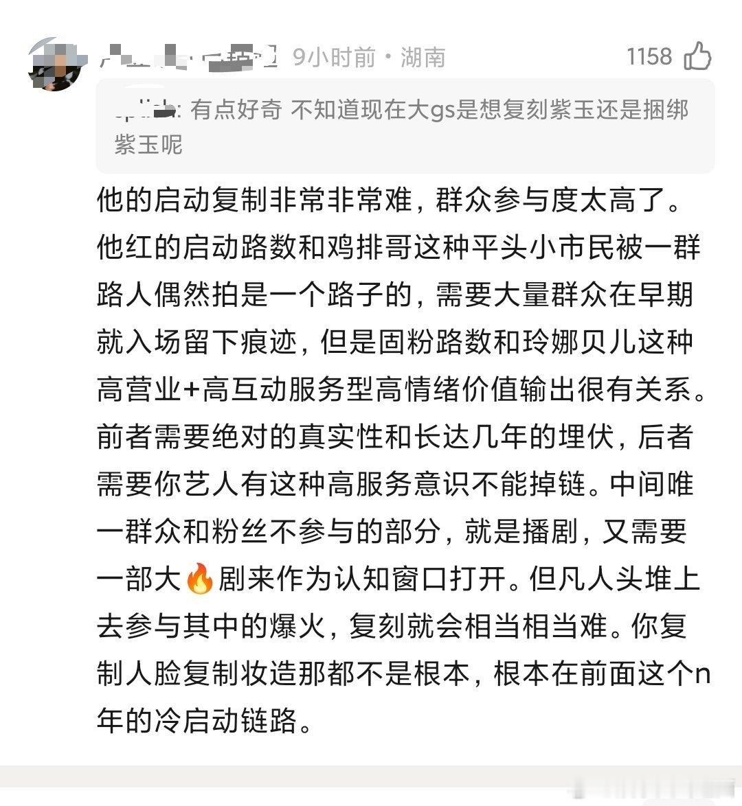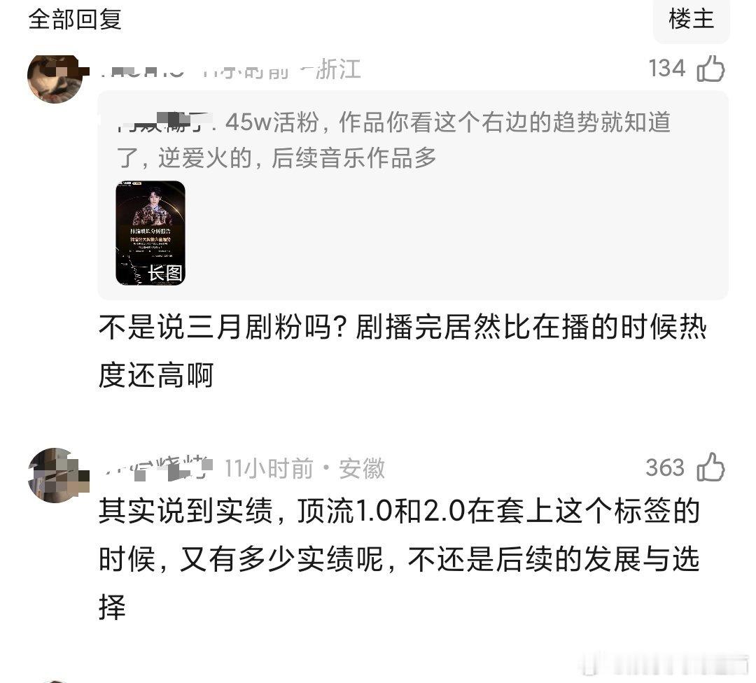 看了今天梓渝独爆的欢网长文在郫县的搬运,已经很久没看到四千楼的高楼了,好多路人围观。在郫县这种地方难得都是比较客观的评价,大家对于梓渝独爆的共情点在于,他既没有家世背景,也没有大IP资源傍身,且完全没有被资本押宝投注,就是民选逆袭的纯草根~“通往罗马的路,早已被身在罗马的人堵住了”没有大营销,没有官方扶持,被围剿,剧播完热度还上升,就是一场纯纯粉丝参与进来打破zb壁垒的顶流路。我之前和业内一个朋友聊的时候就提到过,梓渝的爆🔥就是其它zb永远都无法复刻的,NA能爆是因为剧播期间人🔥反哺了剧,他的成长向粉丝向打工人视频井喷,才让他得以成为百家墙头,我当时会点开NA也是因为刷到了他的打工视频。后续不管是音乐节还是新歌商务都属于个人曝光,流量非常稳并且持续吸粉。从17岁出道开始无论有没有公司支持,他从没放弃过梦想和一直持续营业,这就是他中短视频素材还有个人成长史能够长久累计下来的根本。最后总结就是:靠民选和靠自己,确实没人能打败一个有梦想的人。 欢网认证梓渝是三代顶流 梓渝的唱游地图