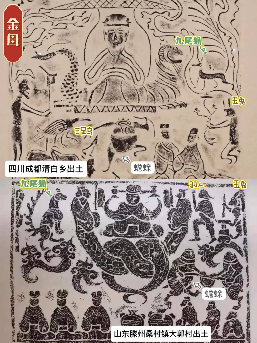 🔹汉画中,出现比较多的是金母,只不过,她不再如传说般似人如虎,而是摇身一变,成为了沉稳盘坐,头戴方胜,主宰命运的妇女。