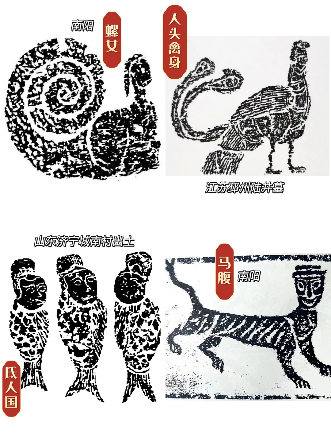 🔹汉画中,人头物身的祥瑞同样丰富。人头禽身的玄女曾帮助皇帝战败蚩尤;人面鱼身的氐人国是黄帝后裔,可上下于天。
