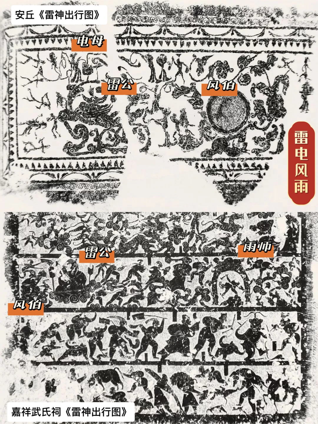 🔹人们对自然现象的想象还不止于此。比如当天上电闪雷鸣时,是雷公击鼓轰隆作响,电母劈斧火花四溅,还有仙人托着成串的石球在地上滚动。