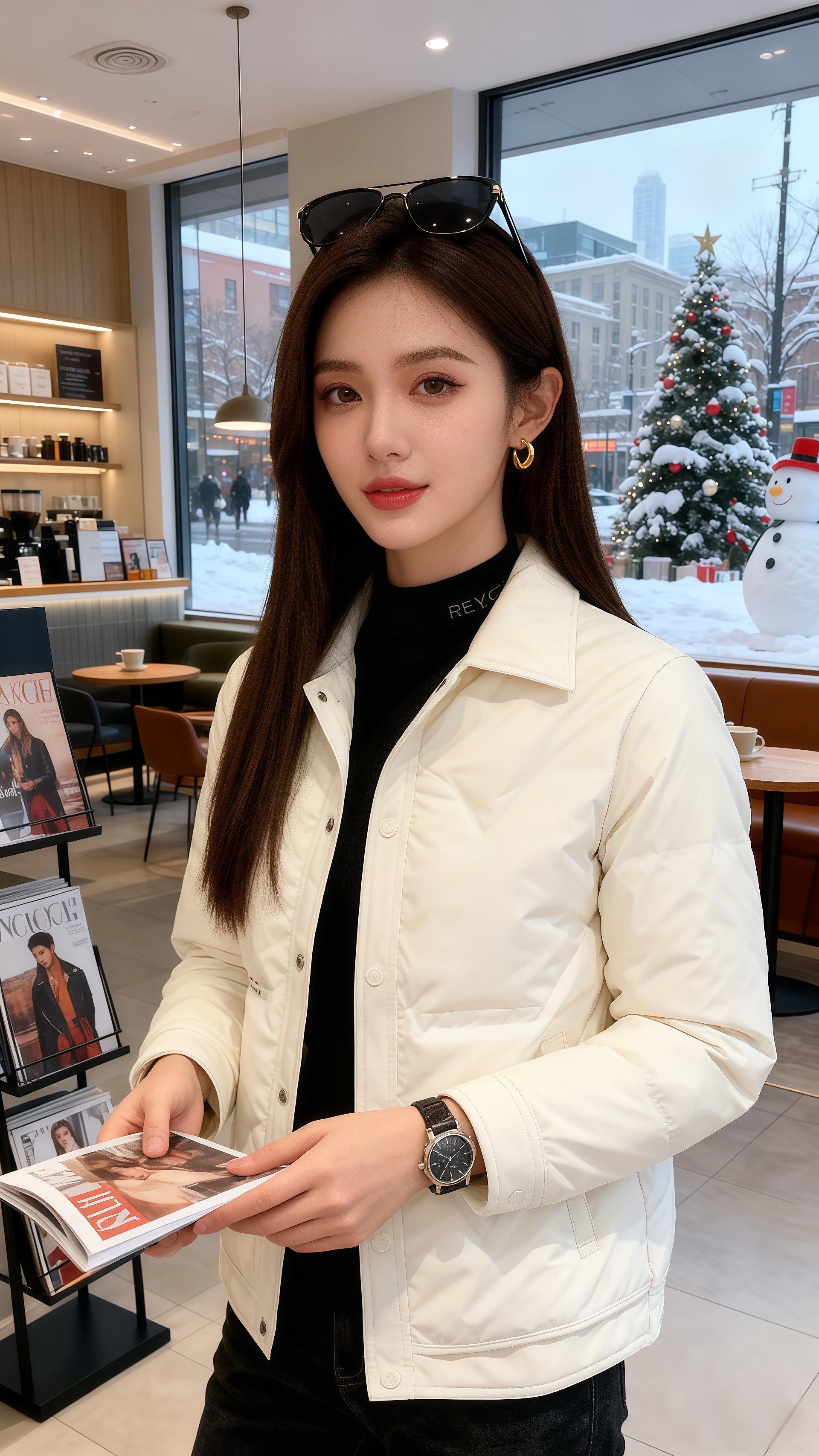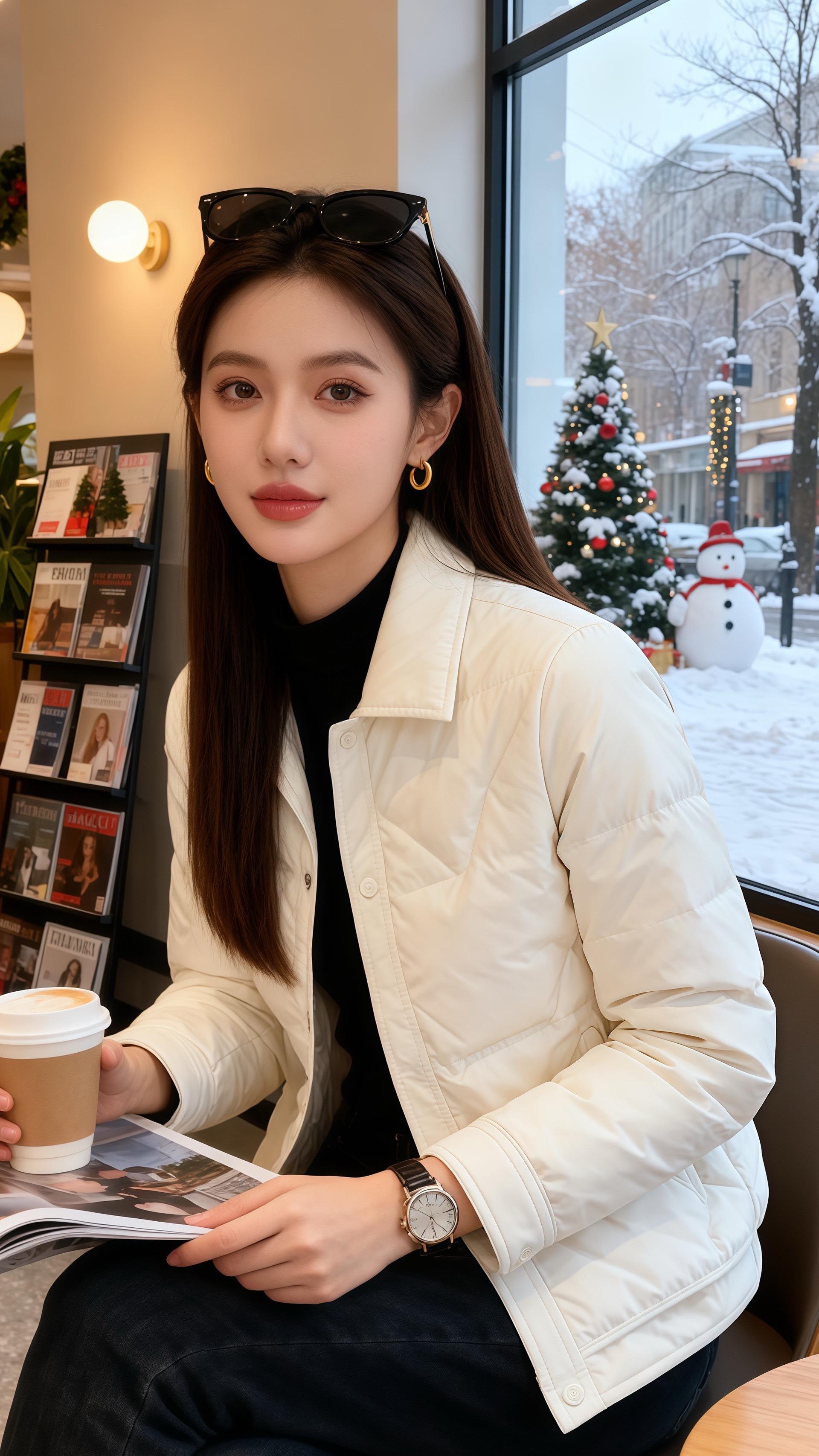 她窝在沙发翻杂志时,棉服的菱格纹路随着动作轻晃,像把细碎的光揉进了衣料里。后来她靠在窗边捧热咖啡,雪落在玻璃外的圣诞树顶,而她袖口那颗纽扣,比雪更温软些。