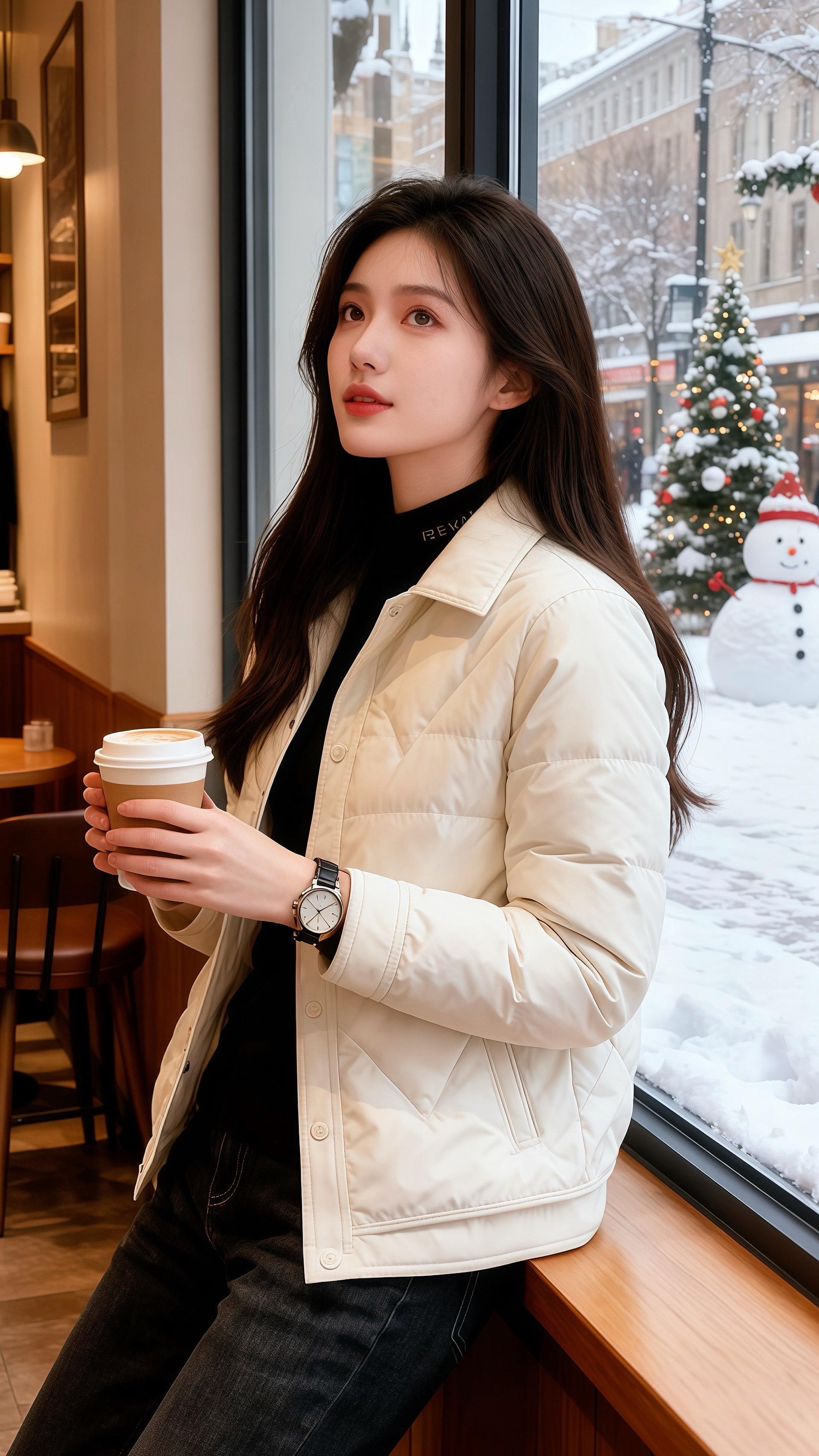 我走过去递纸巾——她发梢沾了点咖啡沫。她抬眼笑时,棉服肩线的弧度刚好顺着脖颈弯下来,像把整个冬天的温柔都裹在了身上。