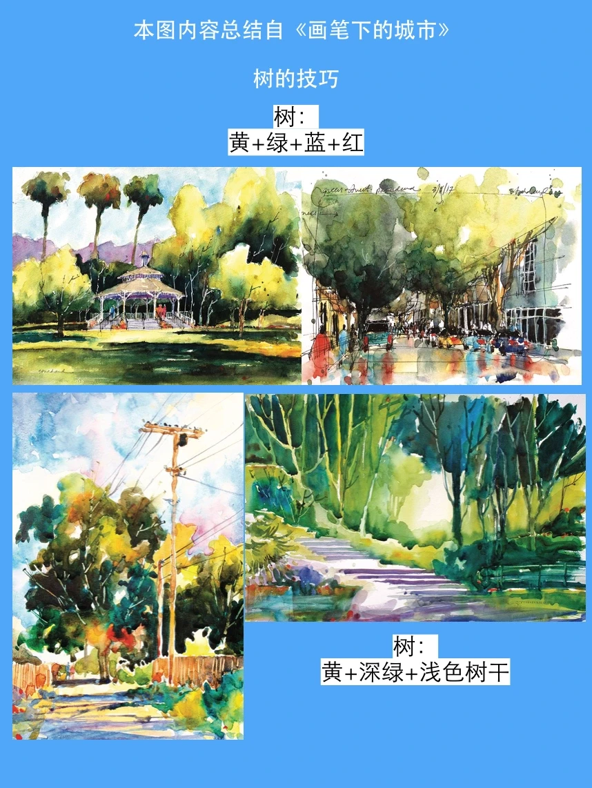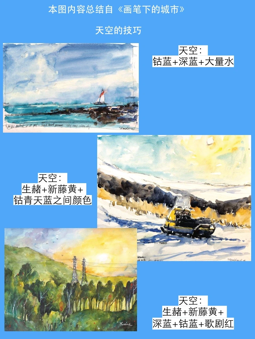 这本书还介绍了很多具象画法,比如阴影、光的反射、夜景、城市、室内、人物什么的,不过因为我最爱画天空和树(个人觉得比较简单)所以分享这两个小技巧!