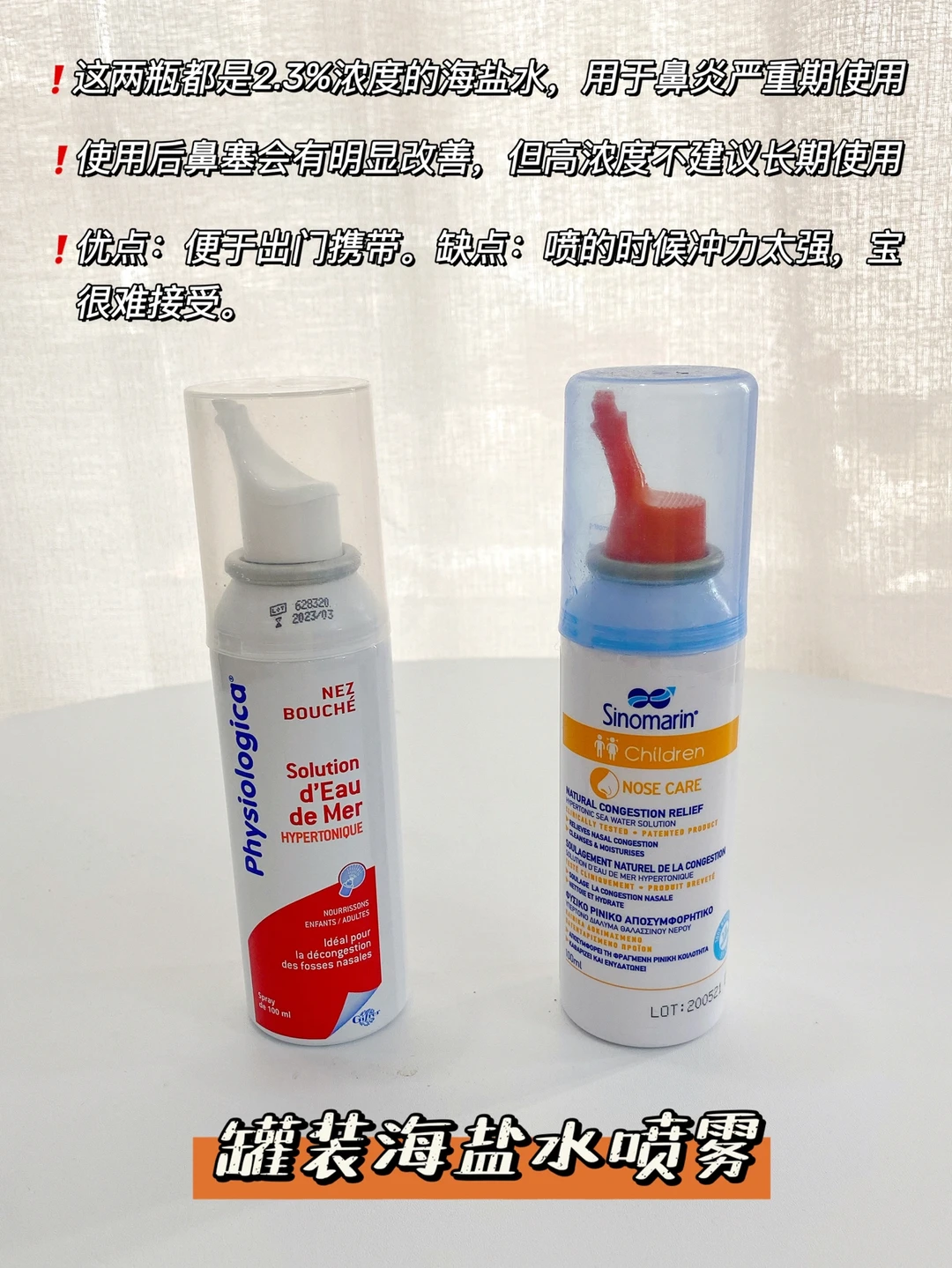 这两款喷雾都是❗️2.3%浓度的高渗海盐水,产品说明都说可以长期使用,但是考虑到它的浓度比较高,所以建议还是鼻炎症状较重的时候用,如果症状减轻日常用❗️0.9%浓度的海盐水洗鼻子就可以了。这种包装出门携带比较方便,但是冲力比较大,赞赞是不太能接受。