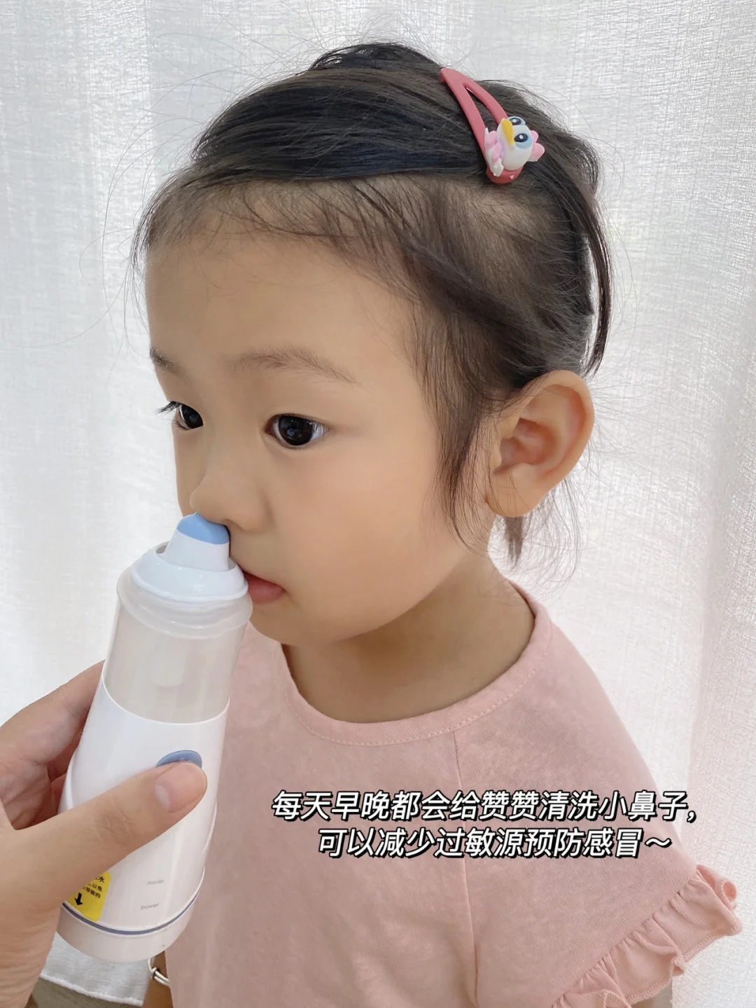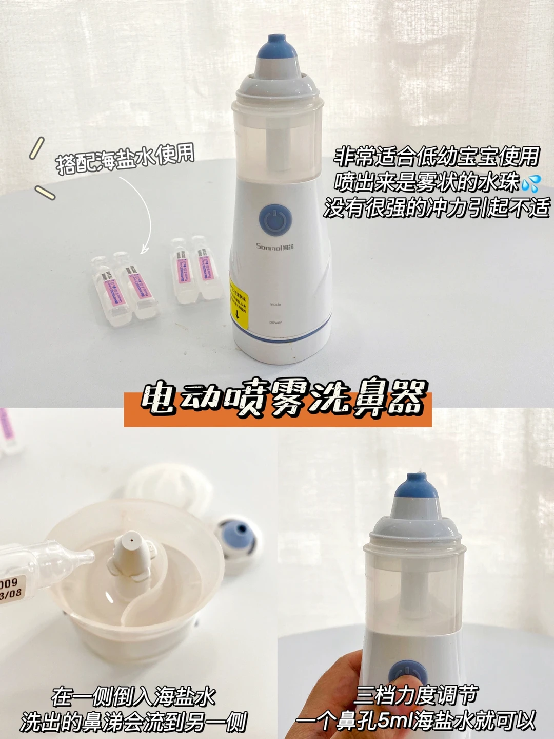这个是医生给开的一个电动洗鼻器,之前都是用灌装喷雾直接给赞赞喷鼻子,冲力太大每次都抗拒,这个洗鼻器喷出来的是雾状的质地,不会用太大的冲力,宝宝洗着很舒服。搭配海盐水,每天早晚各洗一次鼻子已经成为日常了。⚠️市面上还有手动的洗鼻器,那种还是不建议给小宝宝使用,操作不当容易呛水。