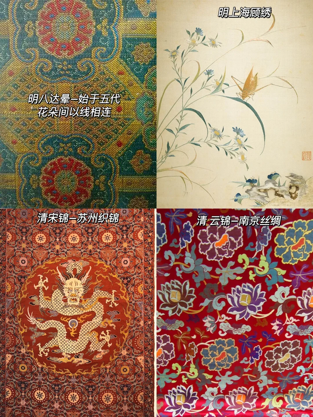 🏞明清江南织造发达,云锦浓烈、宋锦秀丽,苏、粤、湘、蜀四大名绣名扬海外。