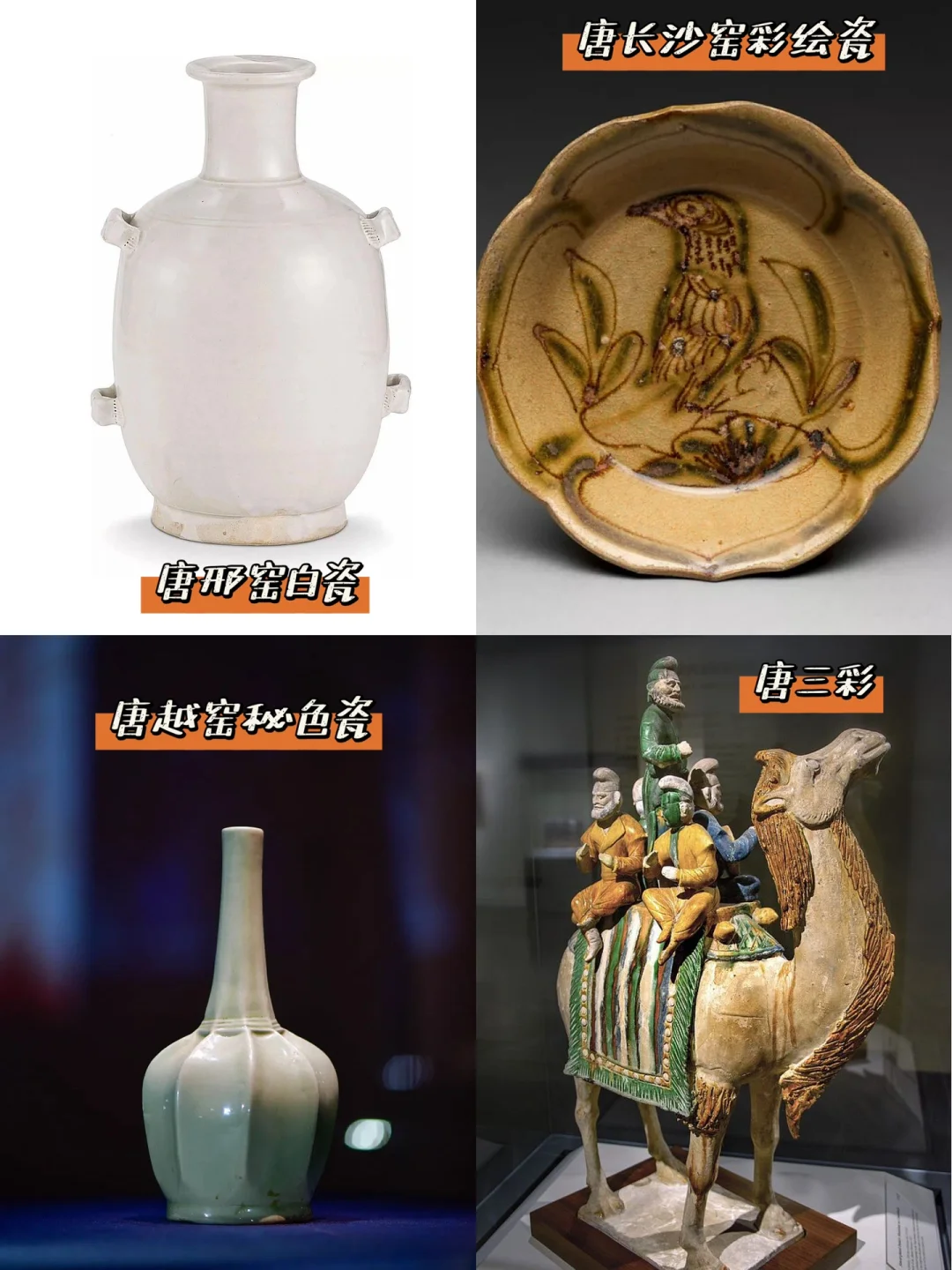 🐫魏晋时期出现陶瓷,此后隋唐五代,有定窑、邢窑的白瓷,越窑的秘色瓷,长沙窑的彩绘瓷,以及最负盛名的唐三彩。