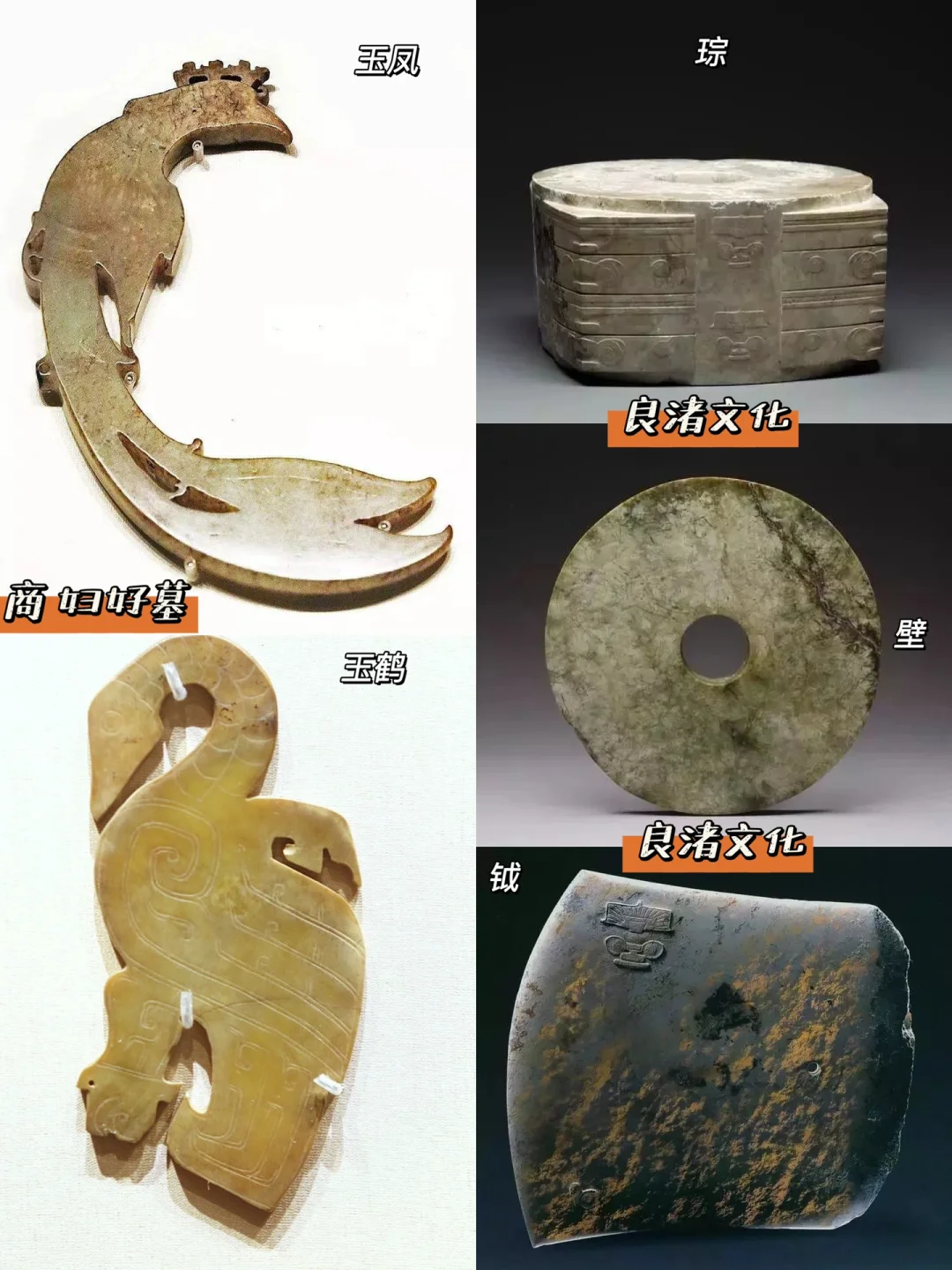 🗡玉源于新石器时代,如良渚文化里,代表礼仪、祭祀的琮、壁,象征权威的钺。商朝时,商王之妻、一代女将妇好墓中,出土了755件玉器。