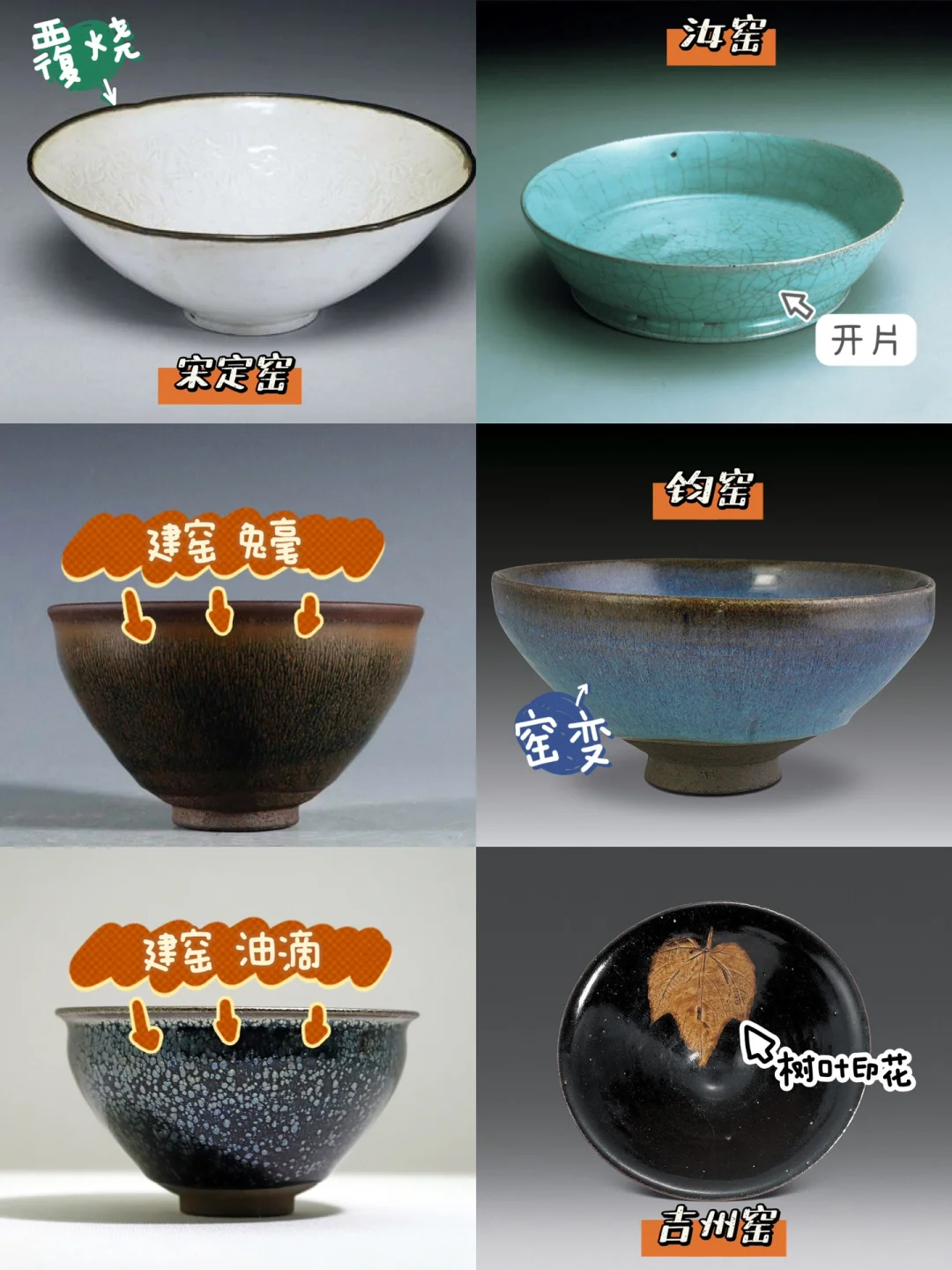 🍵两宋为陶瓷发展的黄金时代,定窑发明覆烧;汝窑创造开片;钧窑呈现窑变;建窑展示兔毫、油滴;吉州窑则用树叶贴花。