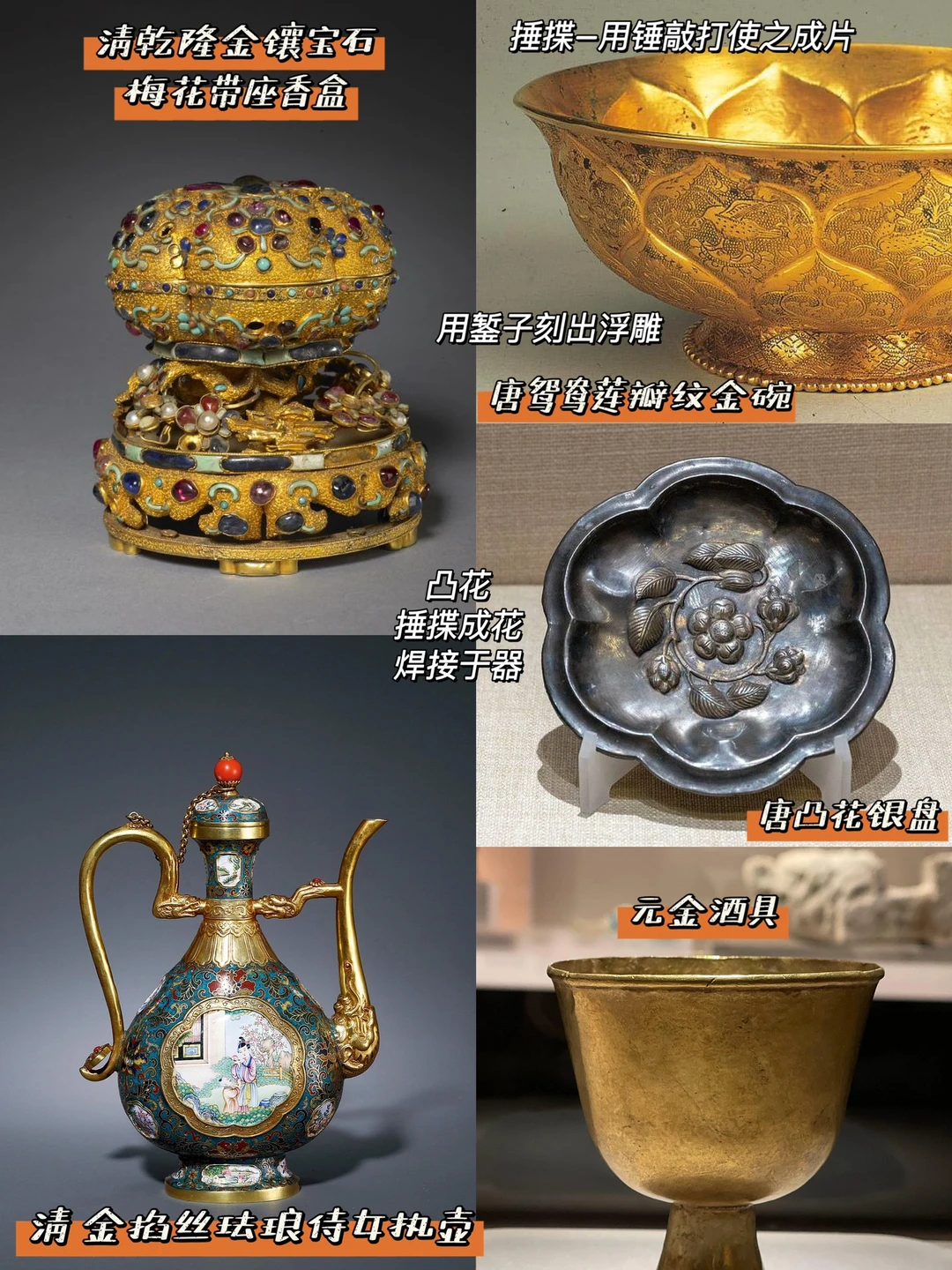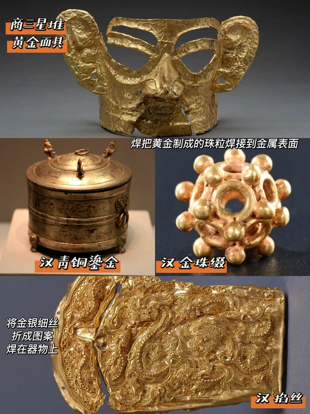 🎭早在商周,三星堆便发现金片。秦汉时期,青铜鎏金开始盛行,还出现了掐丝、焊缀小金珠工艺。