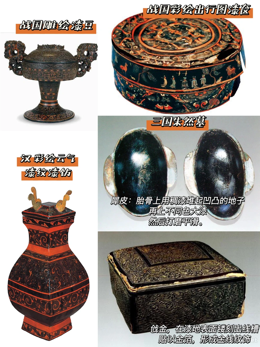 🪵自夏至春秋,漆器持续发展。战国器胎以木为主,常采用透雕技法,以金箔、针刻、铜扣、彩绘为装饰。秦汉漆器的胎质多了夹纻,功能逐渐取代青铜器。