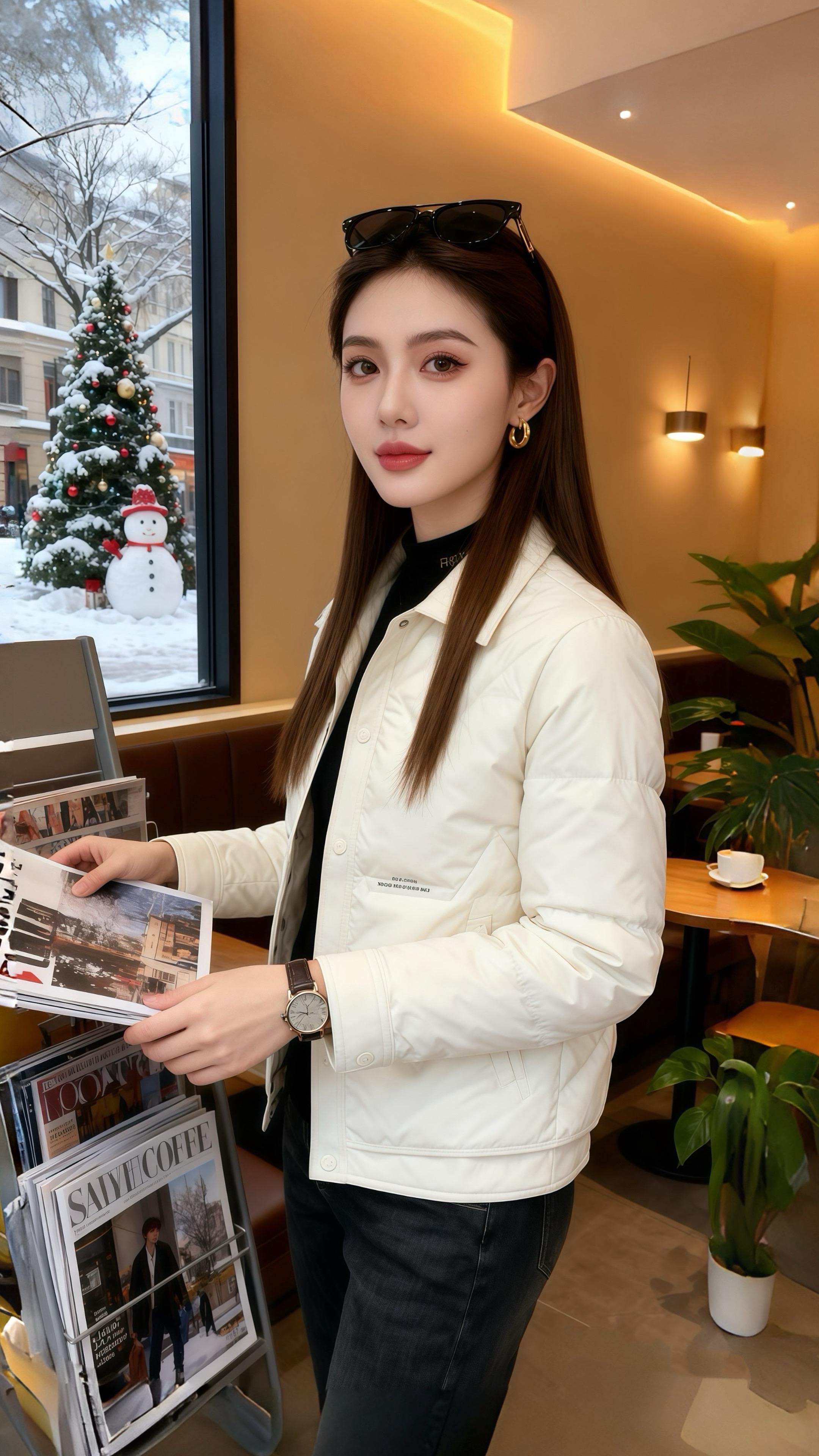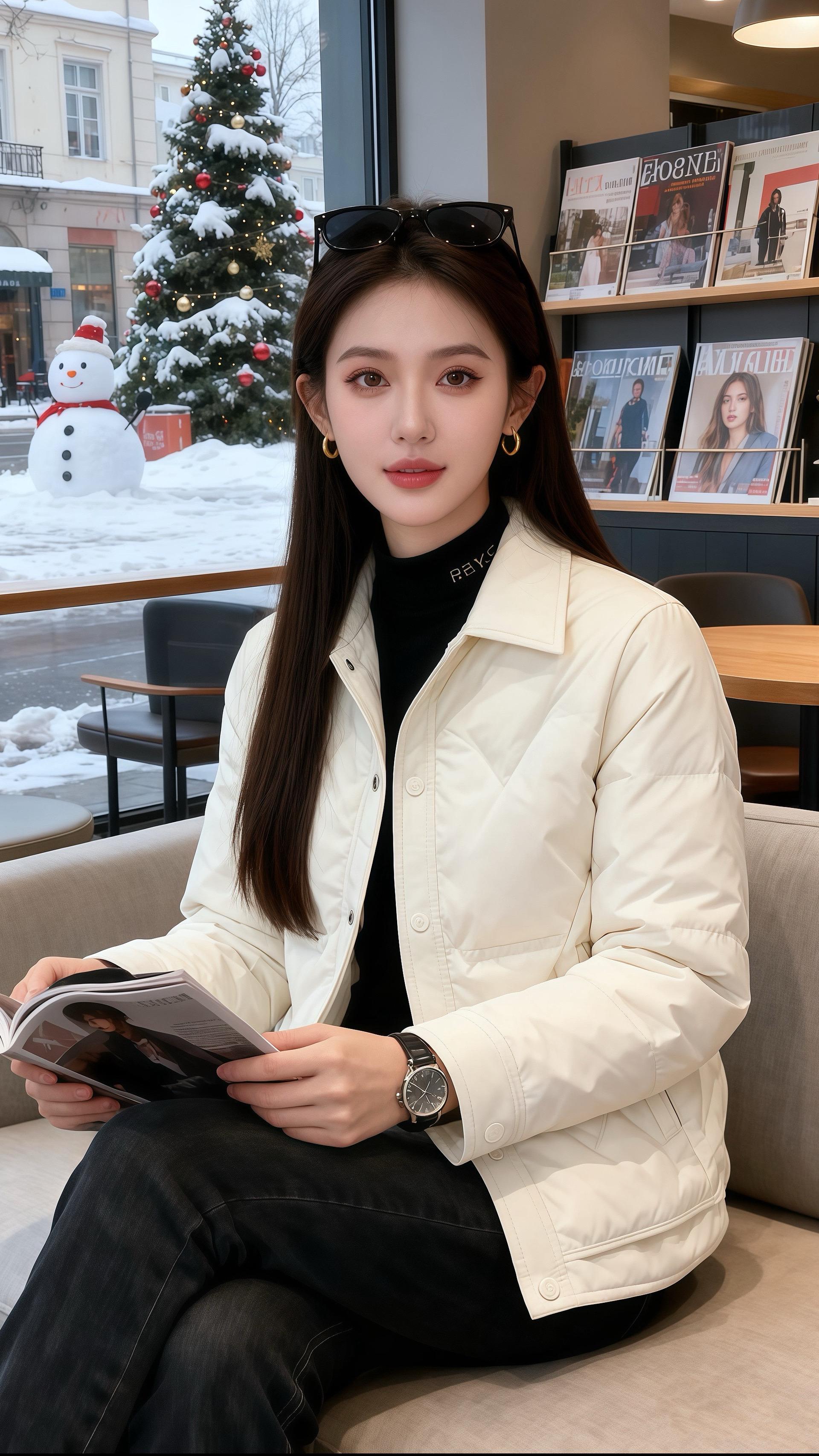 初雪裹着圣诞松的香气扑在橱窗时,她正坐在咖啡厅沙发里翻杂志。米白菱格衫软得像落雪,衬得黑内搭的字边都温,长发滑过肩线,墨镜架在发顶,金环耳饰晃着暖光。