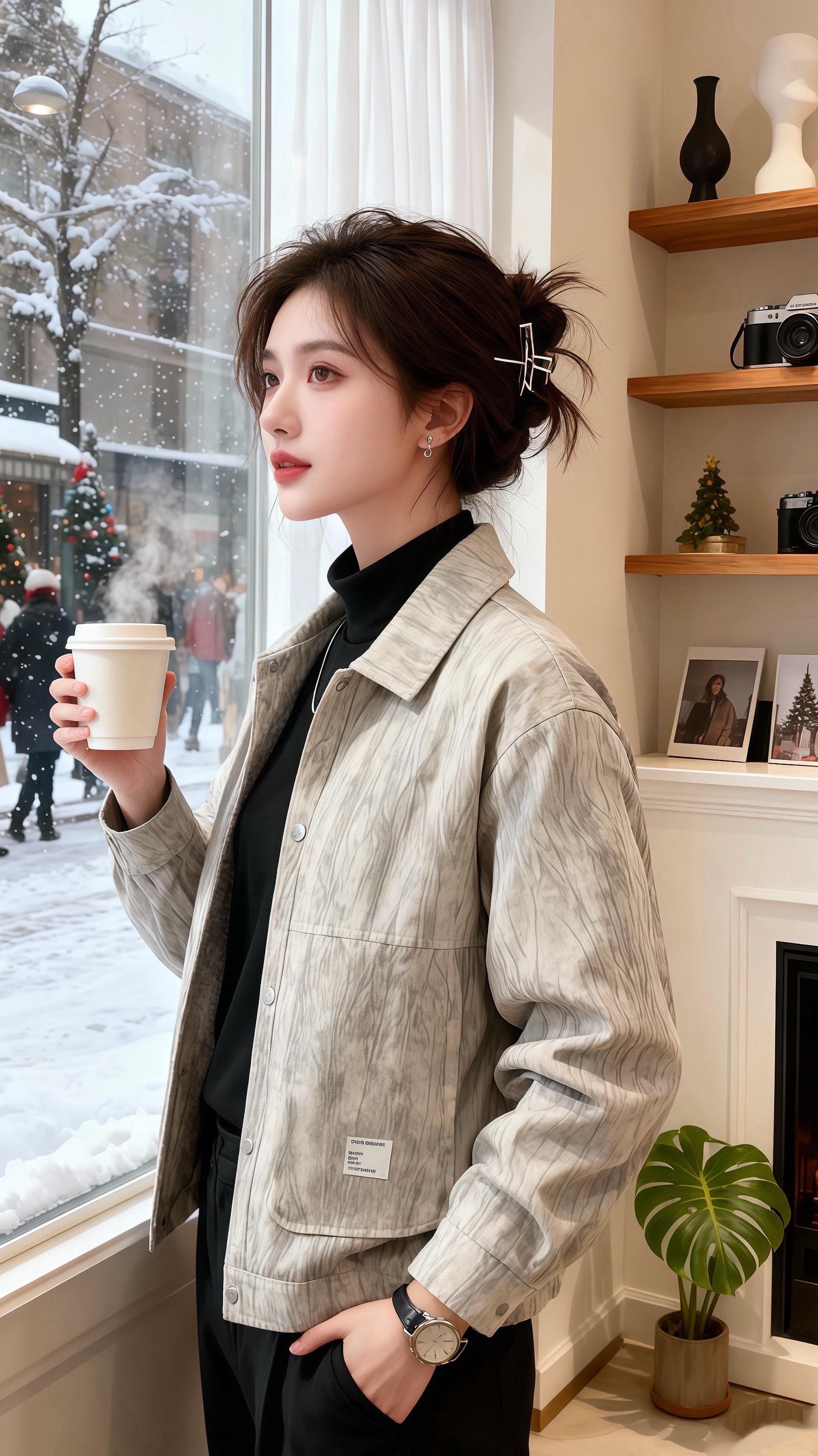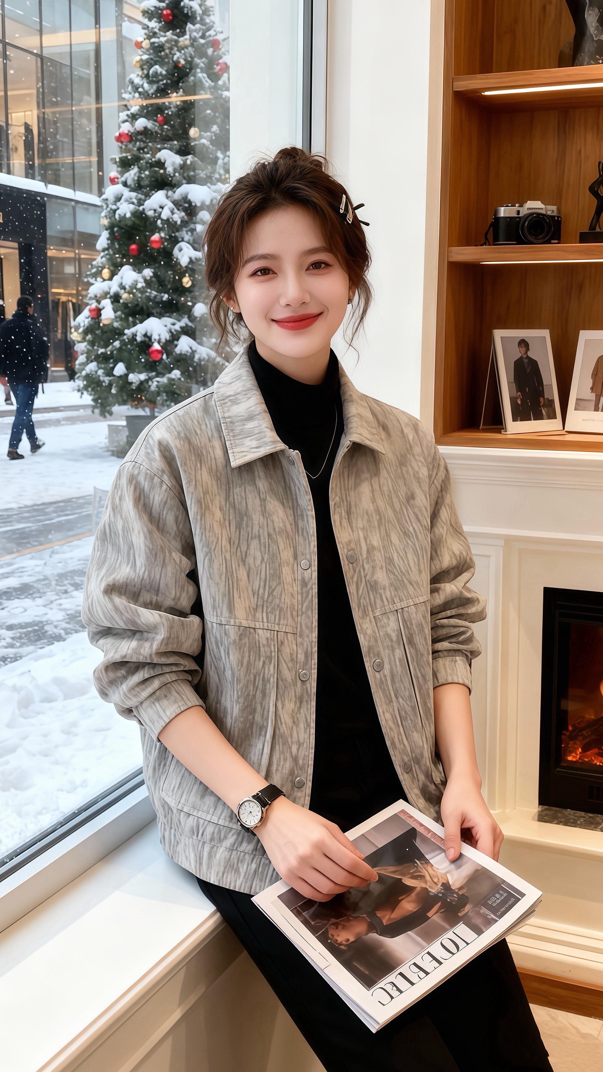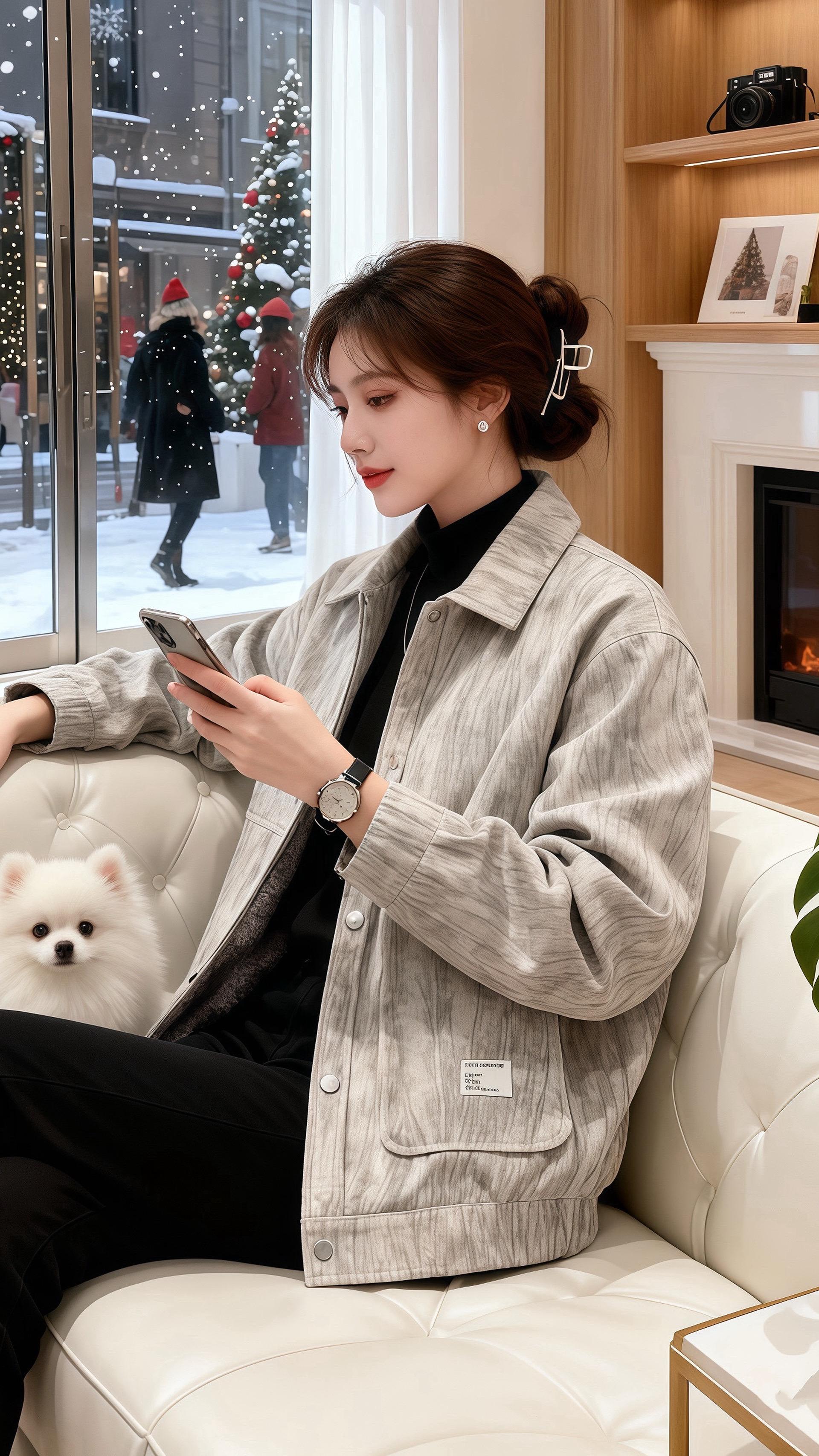 许妍蜷在沙发里刷手机,小博美蹭着她的外套蜷成绒球。皓明推门进来,眼尾先弯了:“这外套的纹理像把冬雪搅软了织进去,比壁炉里的光还温。” 他把热可可递过去,指尖碰了碰她的翻领:“领口松得刚好,不像我那件总卡下巴。”许妍抬眼时,看见他手机屏保是刚才偷拍的画面——她靠在窗边,外套衬得侧脸像落了层软光。 后来她捧咖啡站在窗边,雪落在玻璃上,皓明从身后圈住她:“这料子看着比楼下的雪松还软,等开春穿去公园,风一吹肯定比花轻。” 许妍把咖啡递到他嘴边,听见雪落的声音裹在他话里,软得像这件外套的纹路。