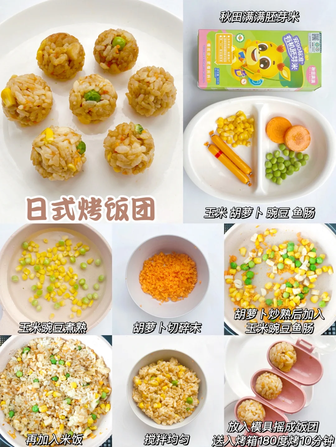 玉米、胡萝卜、豌豆、鱼肠、秋田满满胚芽米