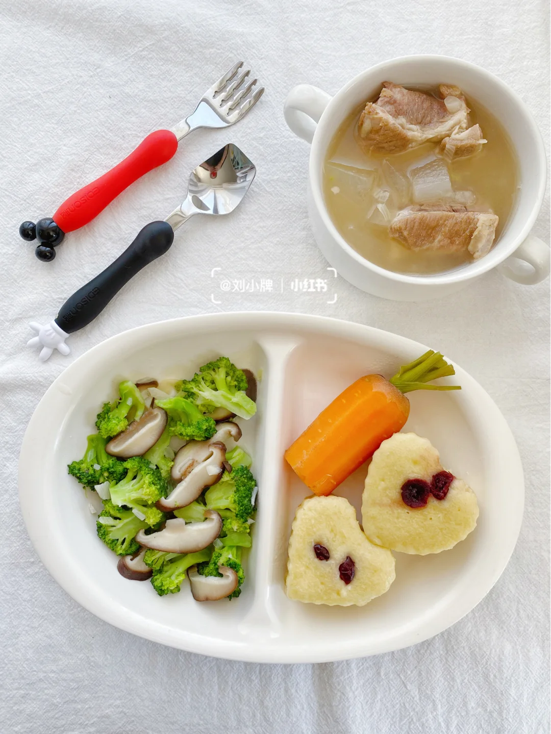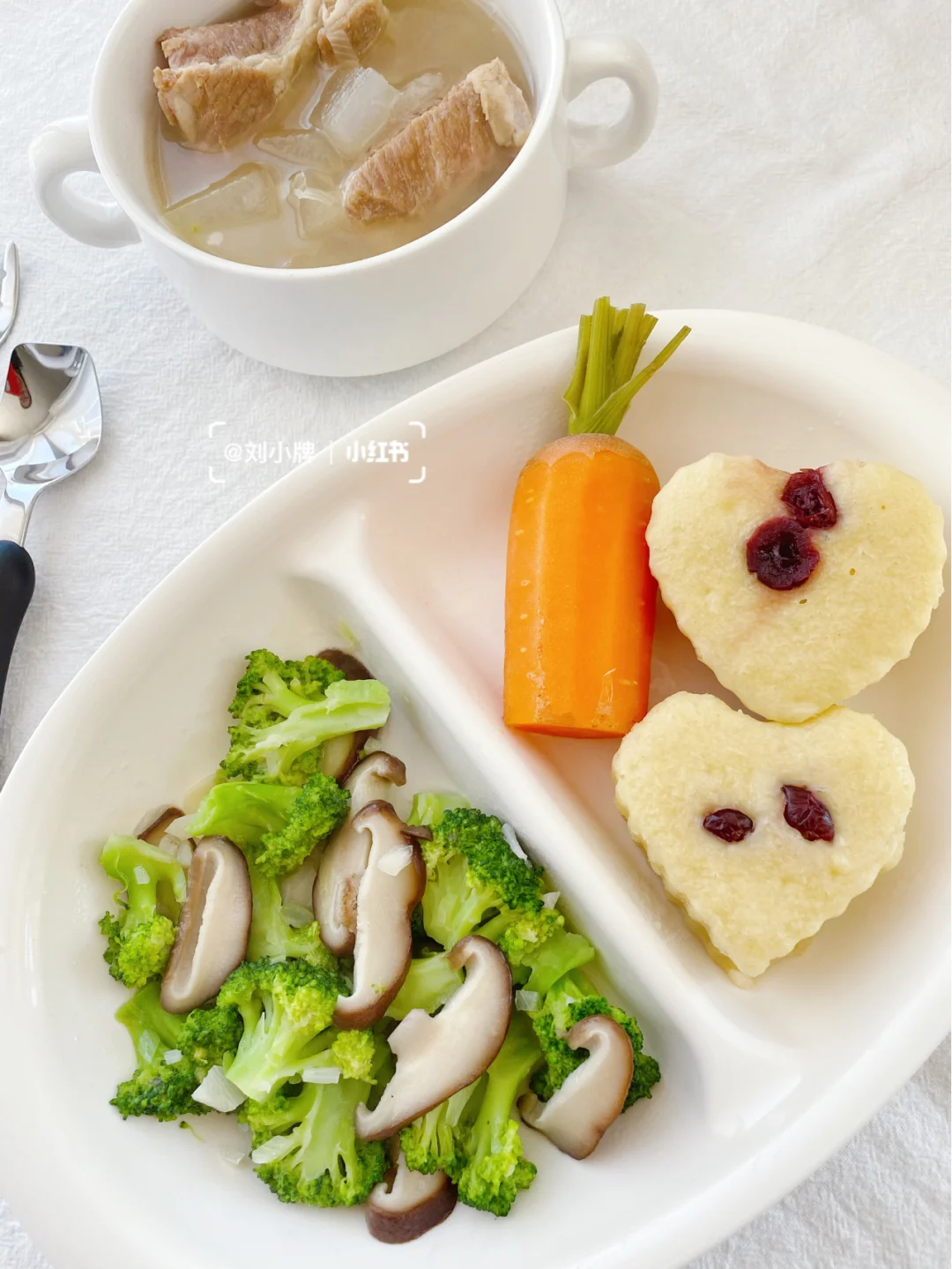 西蓝花炒香菇➕白萝卜排骨汤➕小米发糕