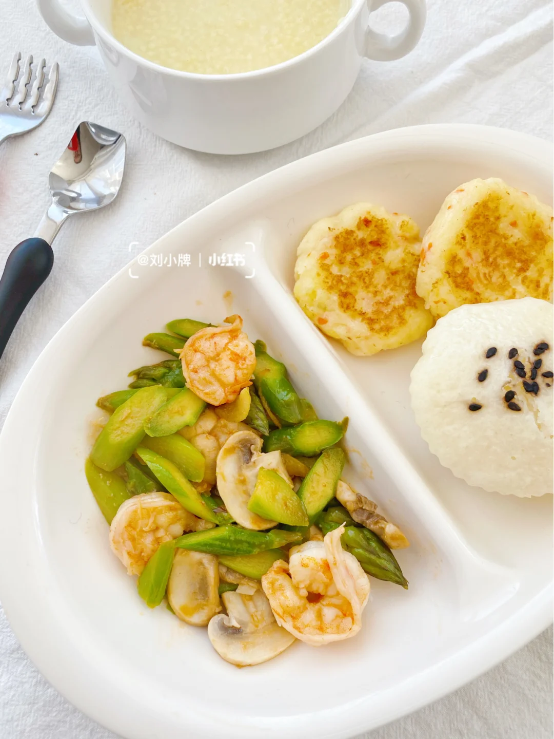 奶酪土豆饼➕芦笋口蘑虾仁➕奶香大米糕➕小米粥
