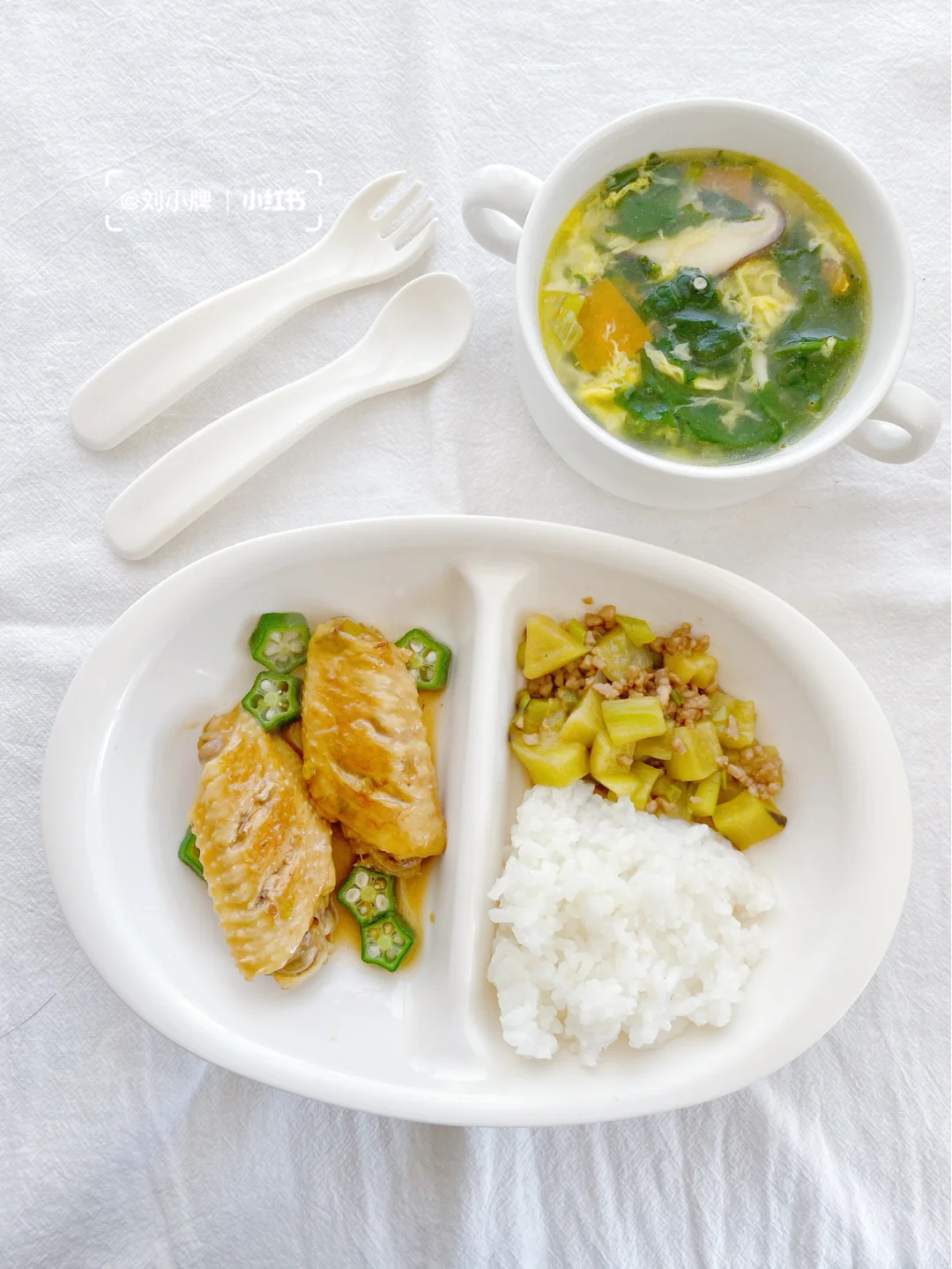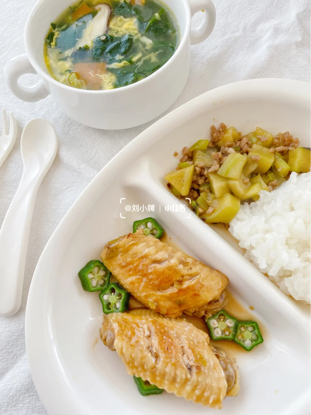 红烧鸡翅➕肉沫茄子➕芙蓉蔬菜汤➕米饭