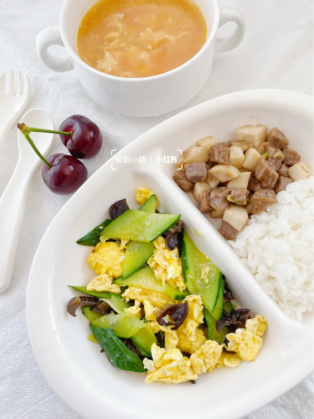 杏鲍菇牛肉丁➕黄瓜木耳炒蛋➕西红柿蛋汤