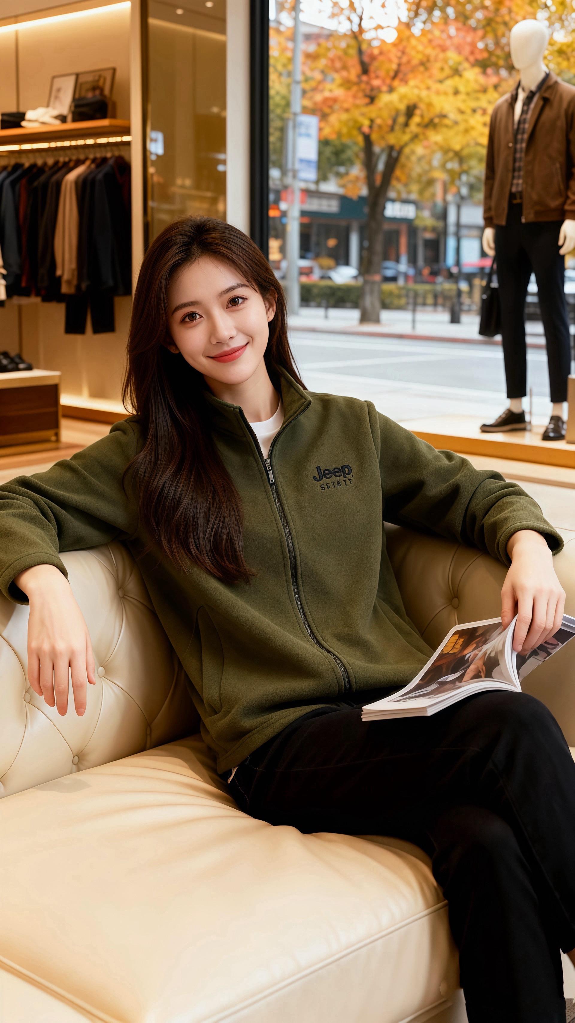 她身上的橄榄绿绒衫很衬此刻——面料看着软和,立领刚好贴住脖颈,袖口收得利落,配着白内搭,松弛里裹着温温的质感。