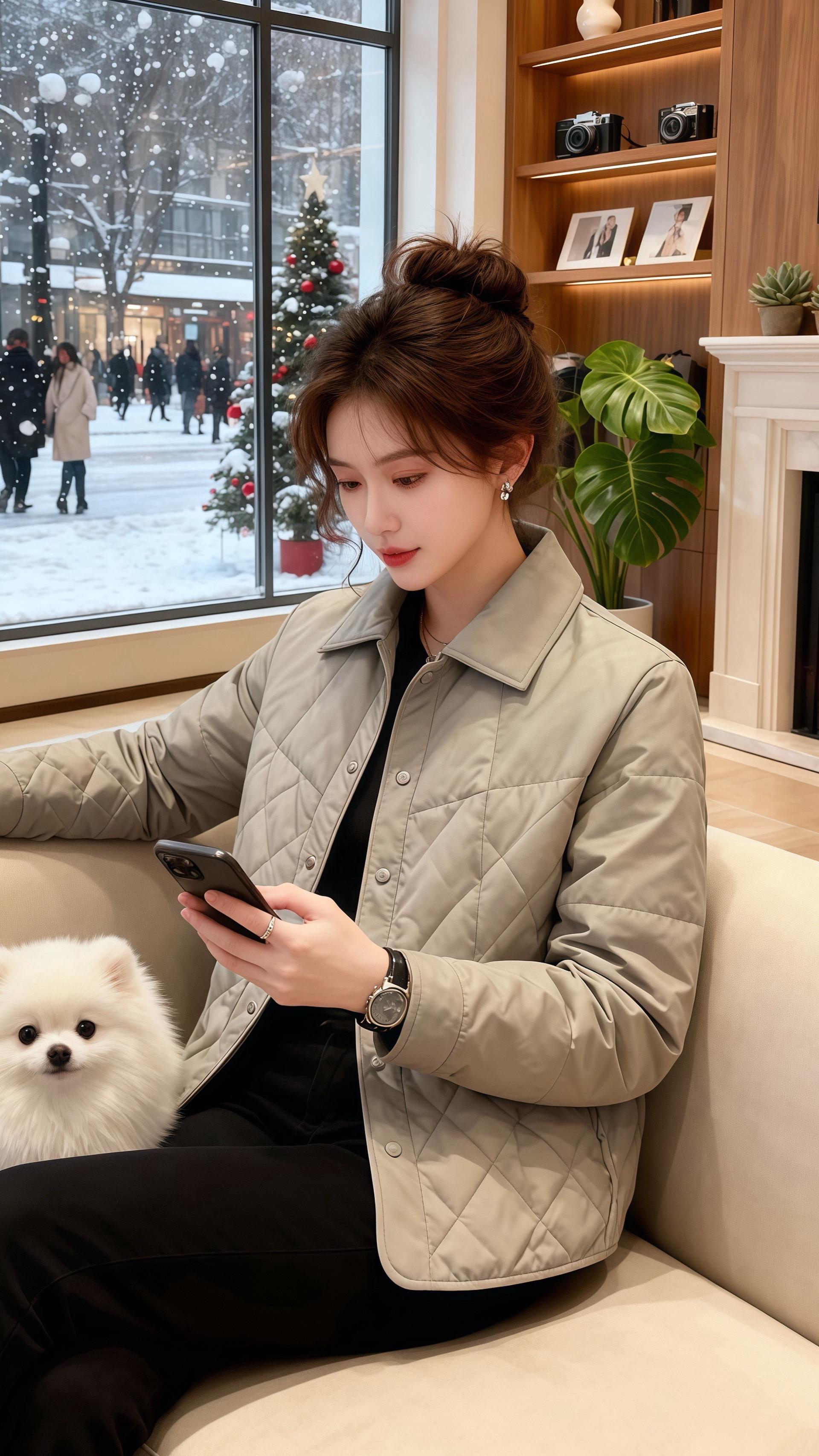 沙发上的博美蹭过来时,许妍正低头刷手机。皓明蹲在地毯边,指尖碰了碰她袖口的压线:“软和,还显肩薄。”许妍抬眼,撞进他带笑的瞳孔——去年圣诞他说她“裹成小熊也可爱”,今年的措辞像杯温好的酒,落得轻又烫。