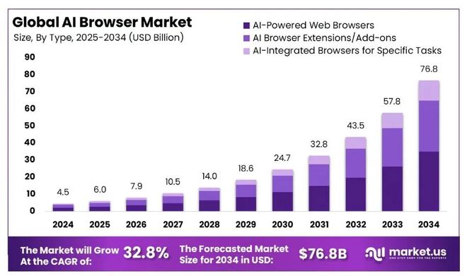 这也是为啥科技巨头争先涌入AI浏览器的赛道。根据market.us的统计报告,全球AI浏览器市场可能在2034年增长至2024年的17倍。