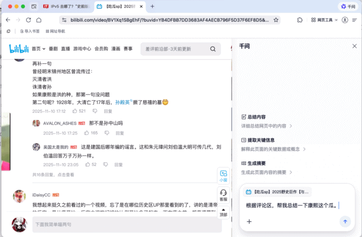 第一个起手式,就是召唤全能千问侧边栏,让它充当互联网省流大师,总结归纳,灵魂追问,啥都能干。