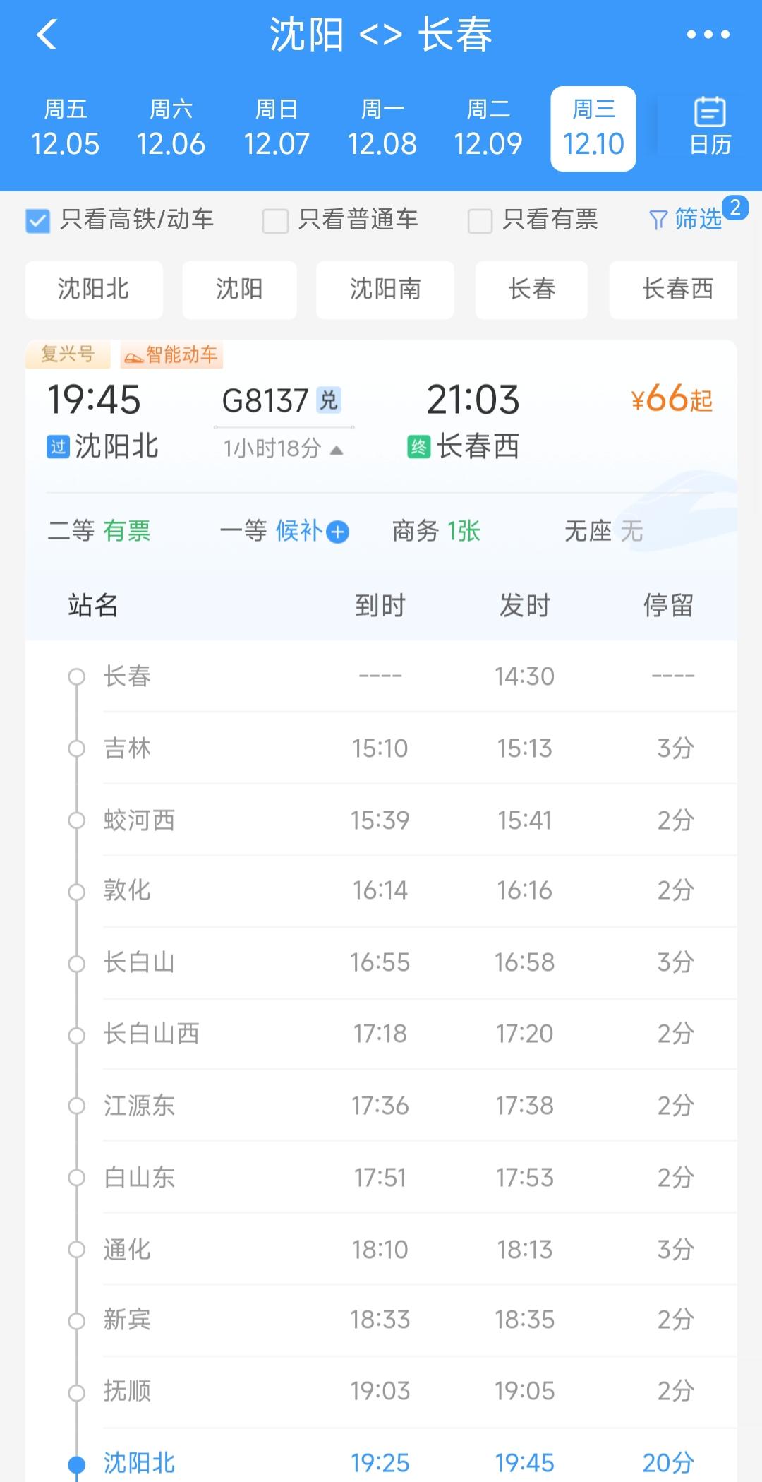 还是要恭喜沈阳与长春。从12月10日开始会有打折的高铁票,这样的话从沈阳到长春的出行成本会大幅度下降。 平时从沈阳北坐高铁到长春西的G8137次列车票价是137元,从12月10日开始G8137次列车票价只需要66元。而且时间点也很不错,晚上7:45从沈阳出发,在晚上9:03到达长春。 这样的话长春人想要去沈阳出差可以做到当天往返。对于想要去沈阳、长春旅游的南方小土豆来说是个好消息,借此契机可以促进沈阳、长春的旅游发展,仔细想想还是很令人期待的。