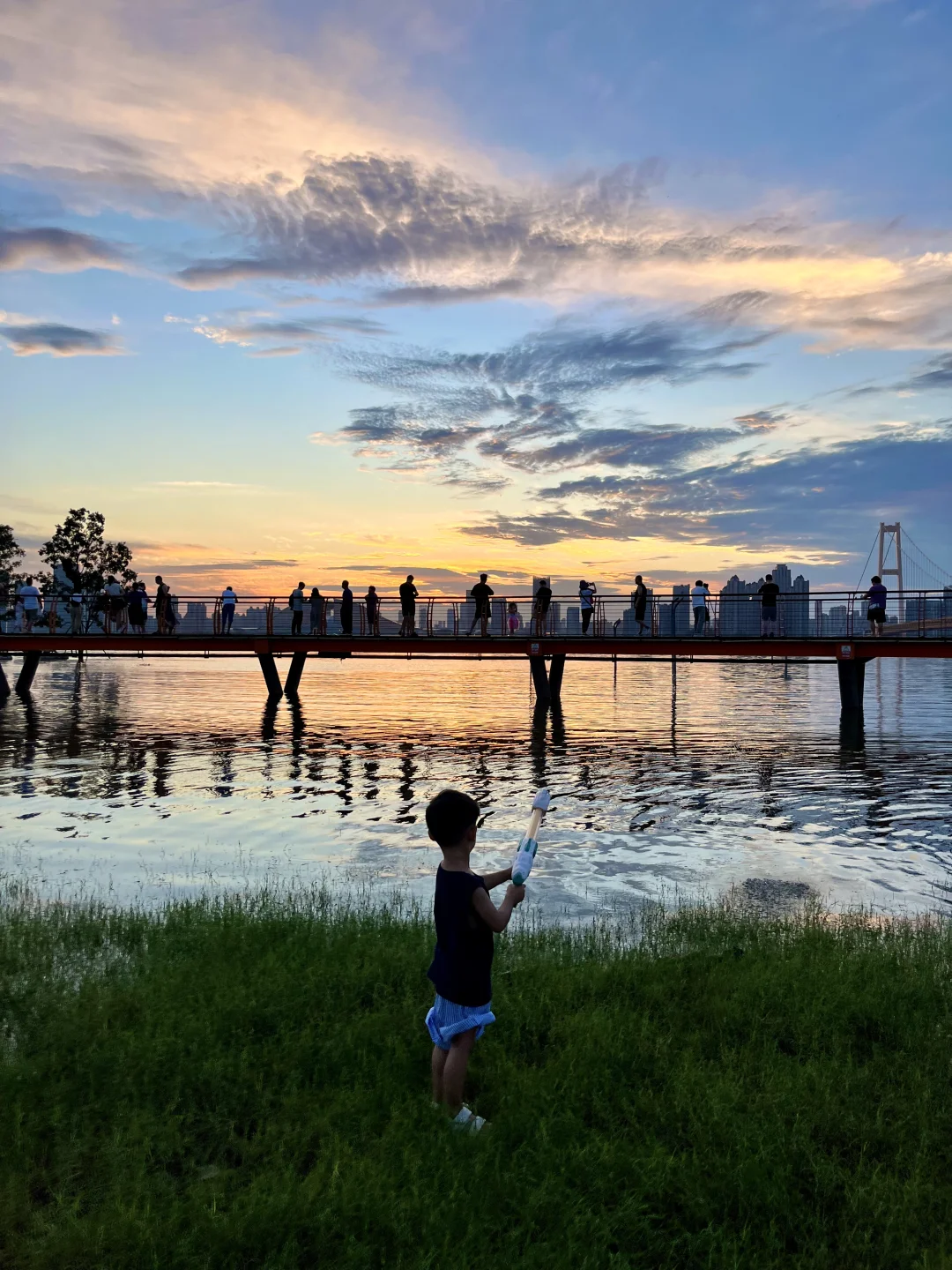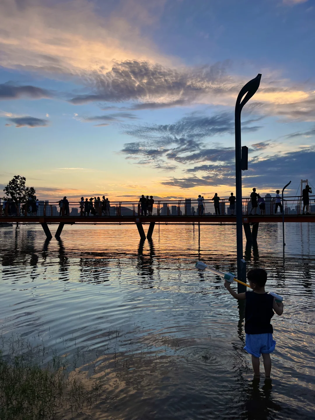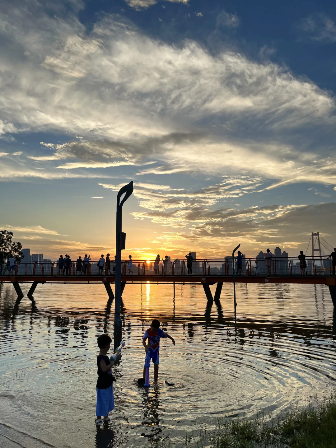 不允许还有人不知道这个玩水地💦 最近武汉的日落真的杀疯了‼️ 在这玩水有种小时候快乐🐟 因为前段时间武汉下大雨,这里变成了“海上栈道” 小朋友带上水枪、捞网,鱼超多🎣 建议六点左右到,捞鱼玩水等着看落日和晚霞 -