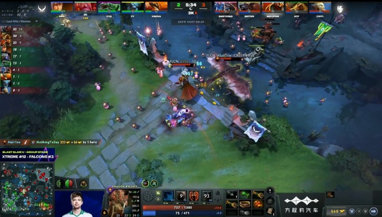 [9分钟]Malrine龙骑士变身推下路一塔,XG没有办法拉扯防御,Falcons经济领先4K。