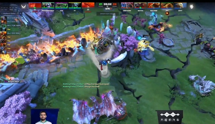 [19分钟]Ame玛西带队包夹动手Malrine龙骑士,龙骑士被fy裂魂人撞晕后掉盾,龙骑士复活以后没有变龙,xxs潮汐交大招留人,玛西连背回来两人完成击杀,除了侧翼被找到的NTS修补匠阵亡外,XG四人围杀了钢背兽、百戏大王和双头龙,断了Falcons一波带盾进攻节奏。