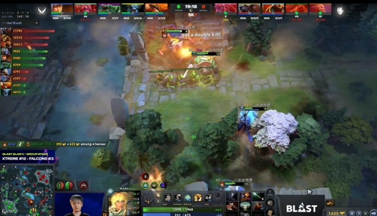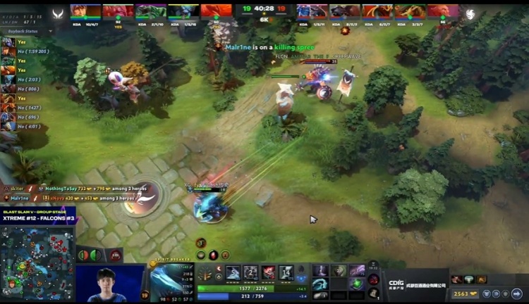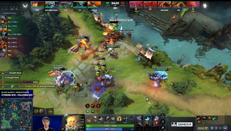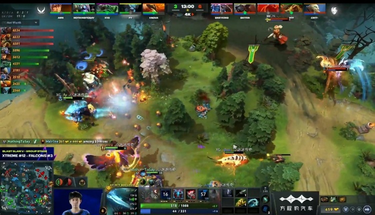 [40分钟]Ame玛西还在读秒,NTS修补匠在外面被skiter熊战士找到,熊战士晕锤加上Sneyking双头龙冰封路径让修补匠无法撤退,xxs潮汐交大招也只是延缓修补匠的阵亡时间,最终XG三人倒地,Falcons中路推进,XG交出3个买活追出来击杀Malrine龙骑士,只是丧失了所有容错,落后的经济又再次达到14K。