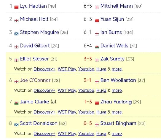 埃利奥特·斯莱塞 3-3 扎克·舒尔第 乔·奥康纳 3-1 本·沃拉斯顿 杰米·克拉克 1-3 周跃龙 斯科特·唐纳森 0-5 斯图尔特·宾汉姆 11月27日,2025斯诺克英锦赛资格赛决胜轮,11局6胜制,胜者晋级正赛。 在已经结束的四场比赛中,吕昊天、迈克尔·霍尔特、斯蒂芬·马奎尔、大卫·吉尔伯特晋级正赛。 袁思俊3-6不敌迈克尔·霍尔特,无缘正赛。