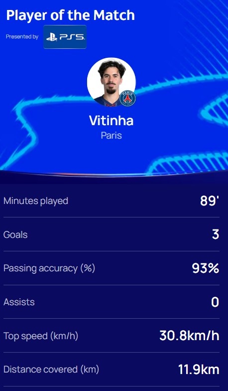 本场比赛维蒂尼亚上演帽子戏法,赛后他也当选欧冠官方评选出的本场比赛最佳球员。
