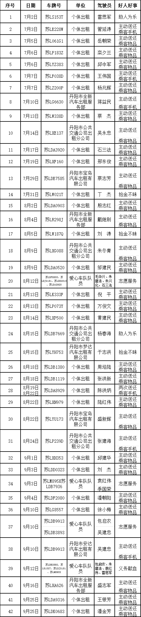 出租汽车行业是公共交通的重要组成部分,是关系民生、服务百姓的窗口行业。为进一步规范出租汽车经营服务行为,提升驾驶员服务质量,树立行业新风尚,弘扬行业正能量,促进出租汽车行业健康发展,丹阳市交通运输执法部门结合我市出租汽车行业好人好事、有责投诉、违法违规等情况,综合评定2025年第三季度出租汽车行业服务质量,现通报如下: